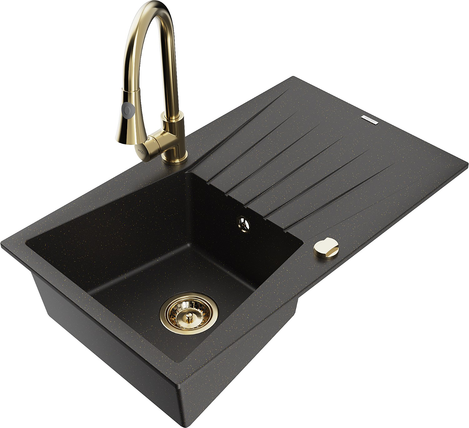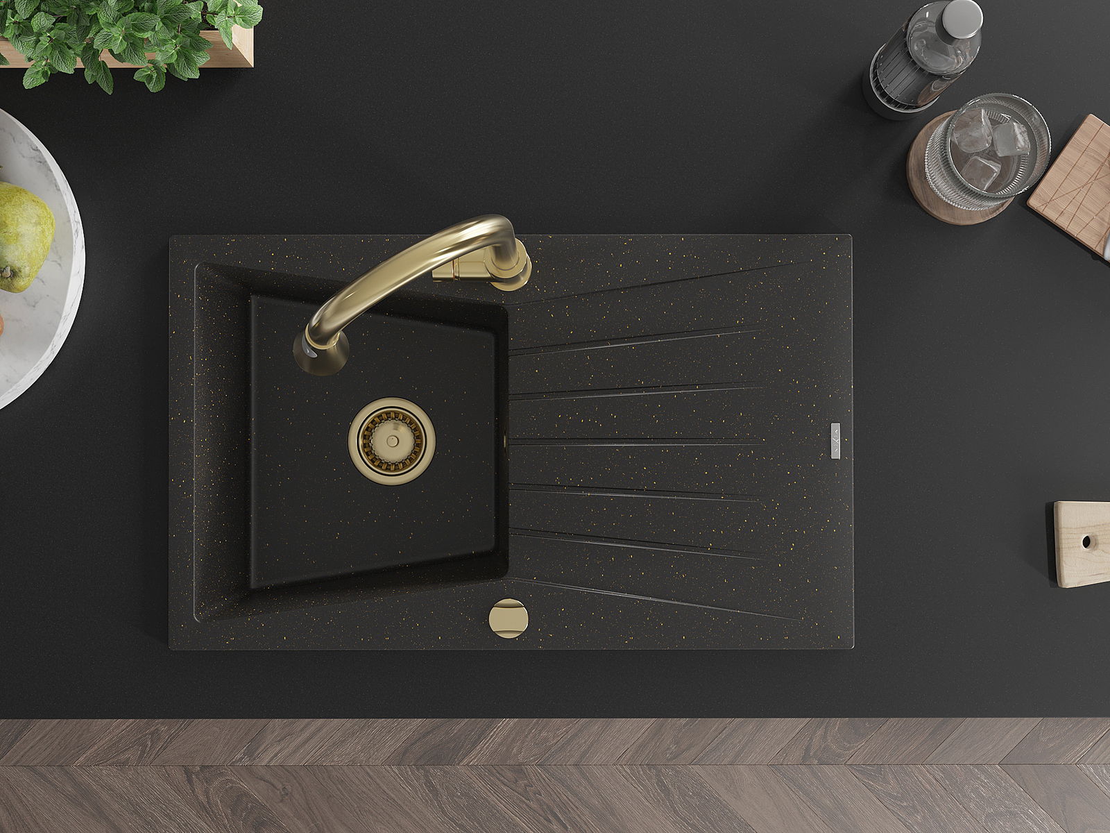Mexen Cesar vienos dubens granito plautuvė su nutekamuoju paviršiumi ir virtuviniu maišytuvu Elia, juoda/auksinis metalikas