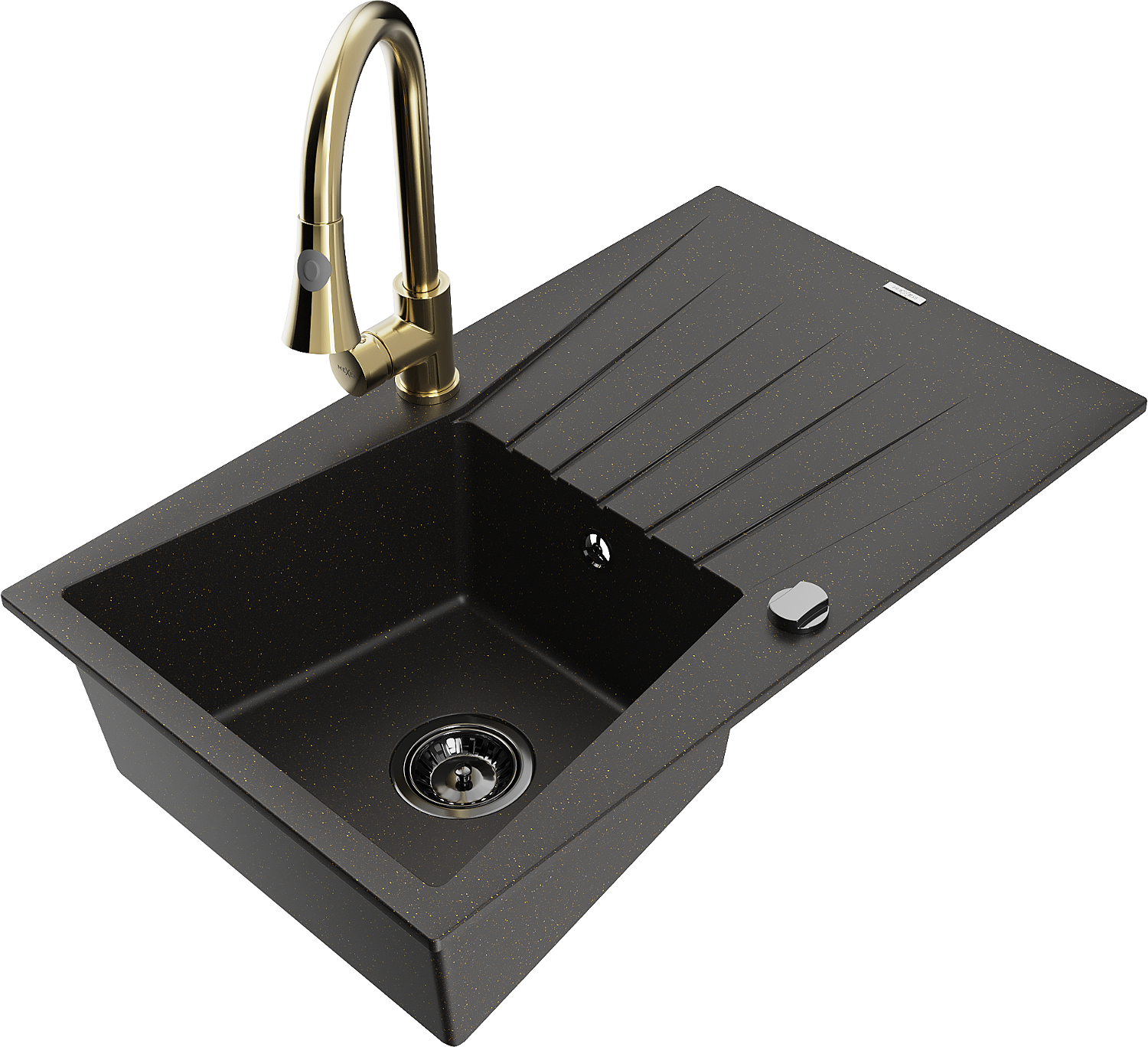 Mexen Cesar granitinė vienos kameros plautuvė su nutekėjimo zona ir virtuviniu maišytuvu Elia, juoda/auksinis metalikas