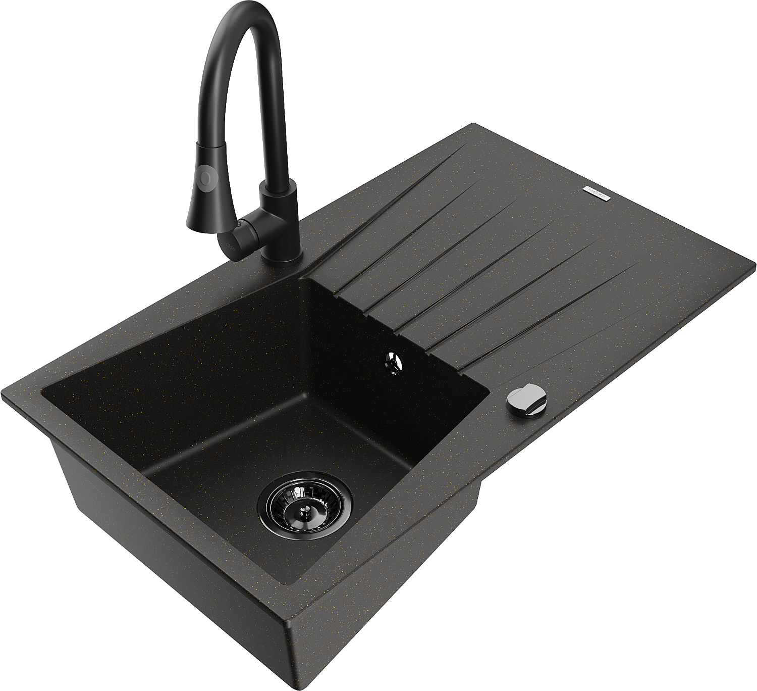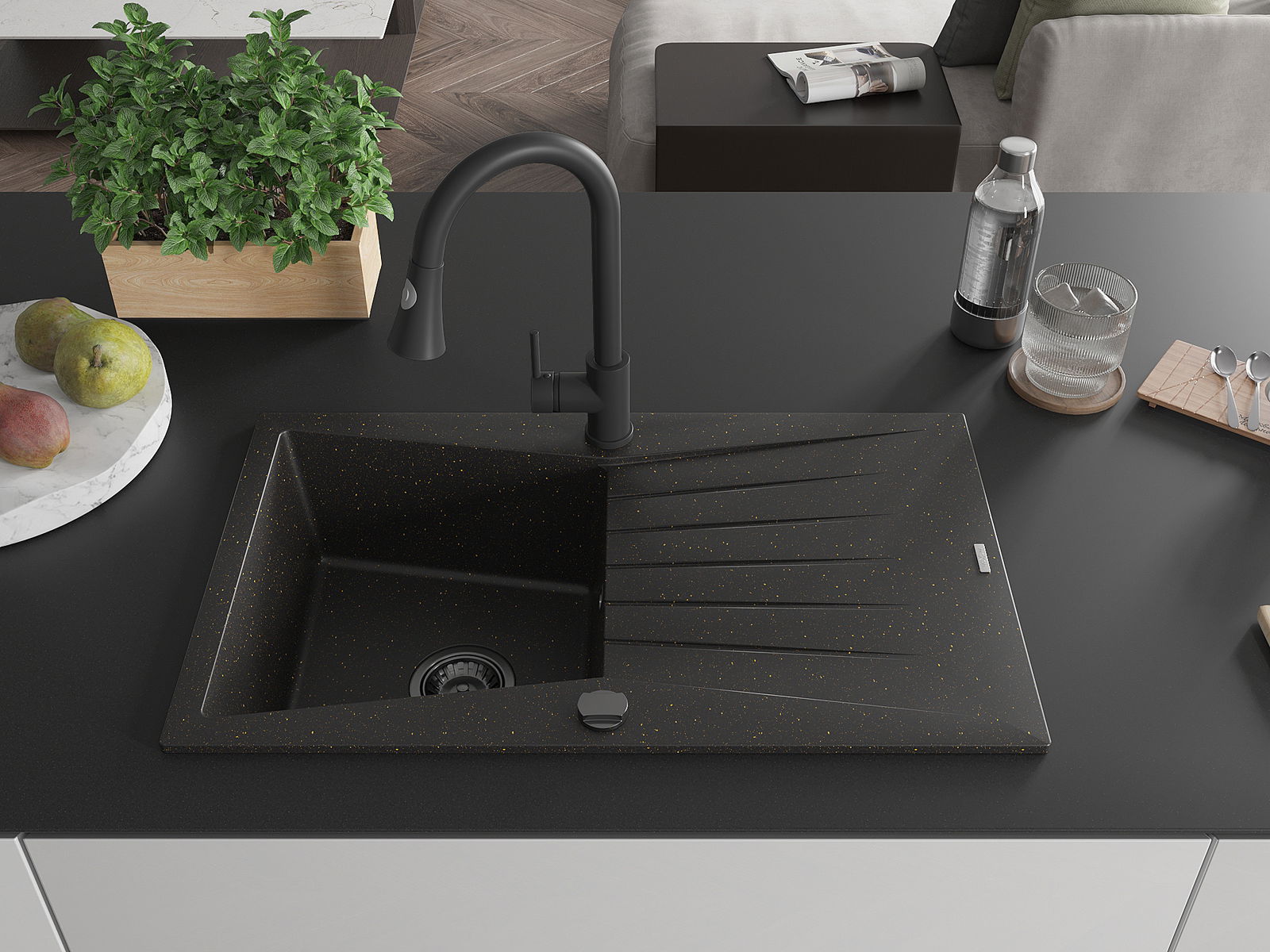 Mexen Cesar granitinė 1 skyrelio plautuvė su nutekėjimo lentyna ir virtuvės maišytuvu Elia, juodas/auksinis metalikas
