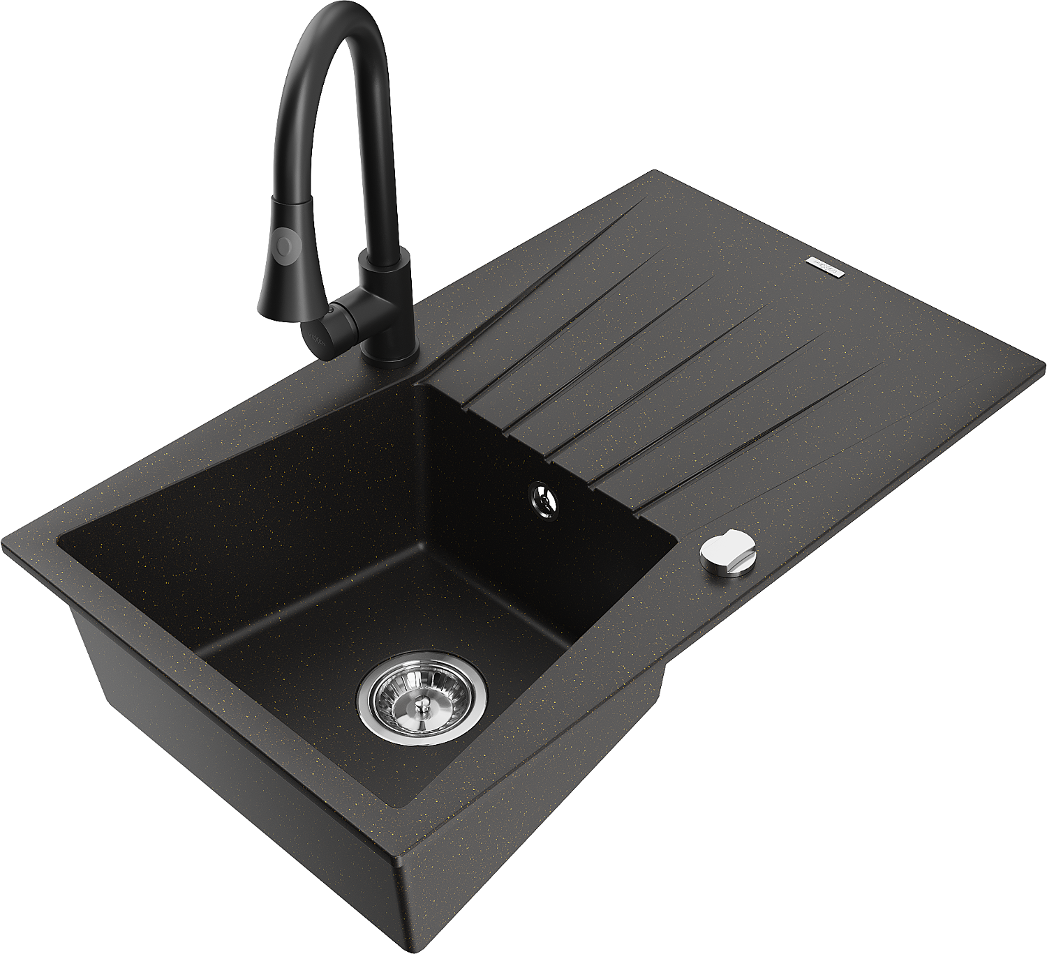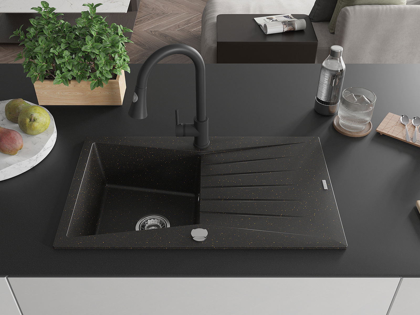 Mexen Cesar granitinė vienos kameros kriauklė su varvekliu ir virtuviniu maišytuvu Elia, juoda/auksinė metalikas