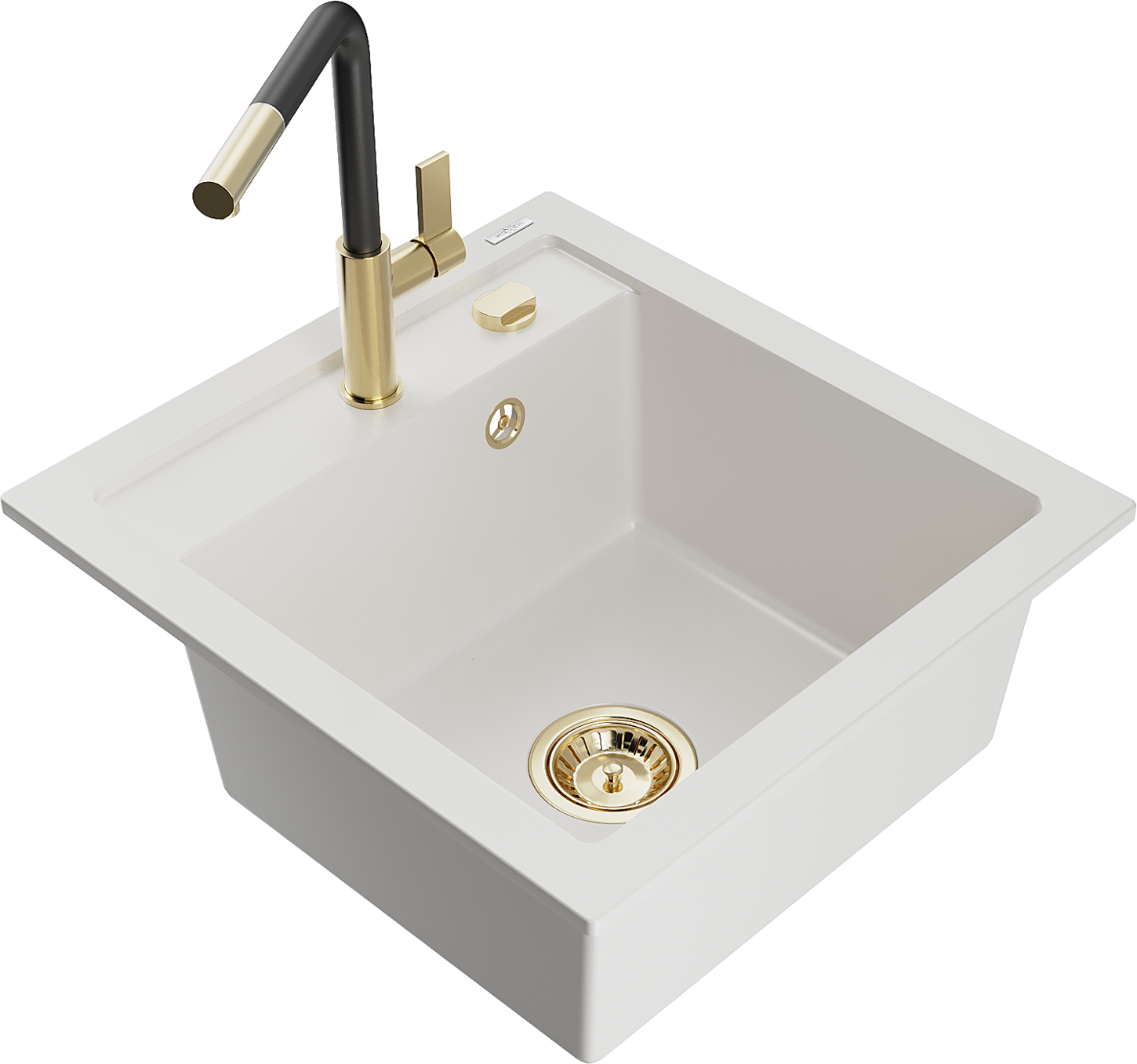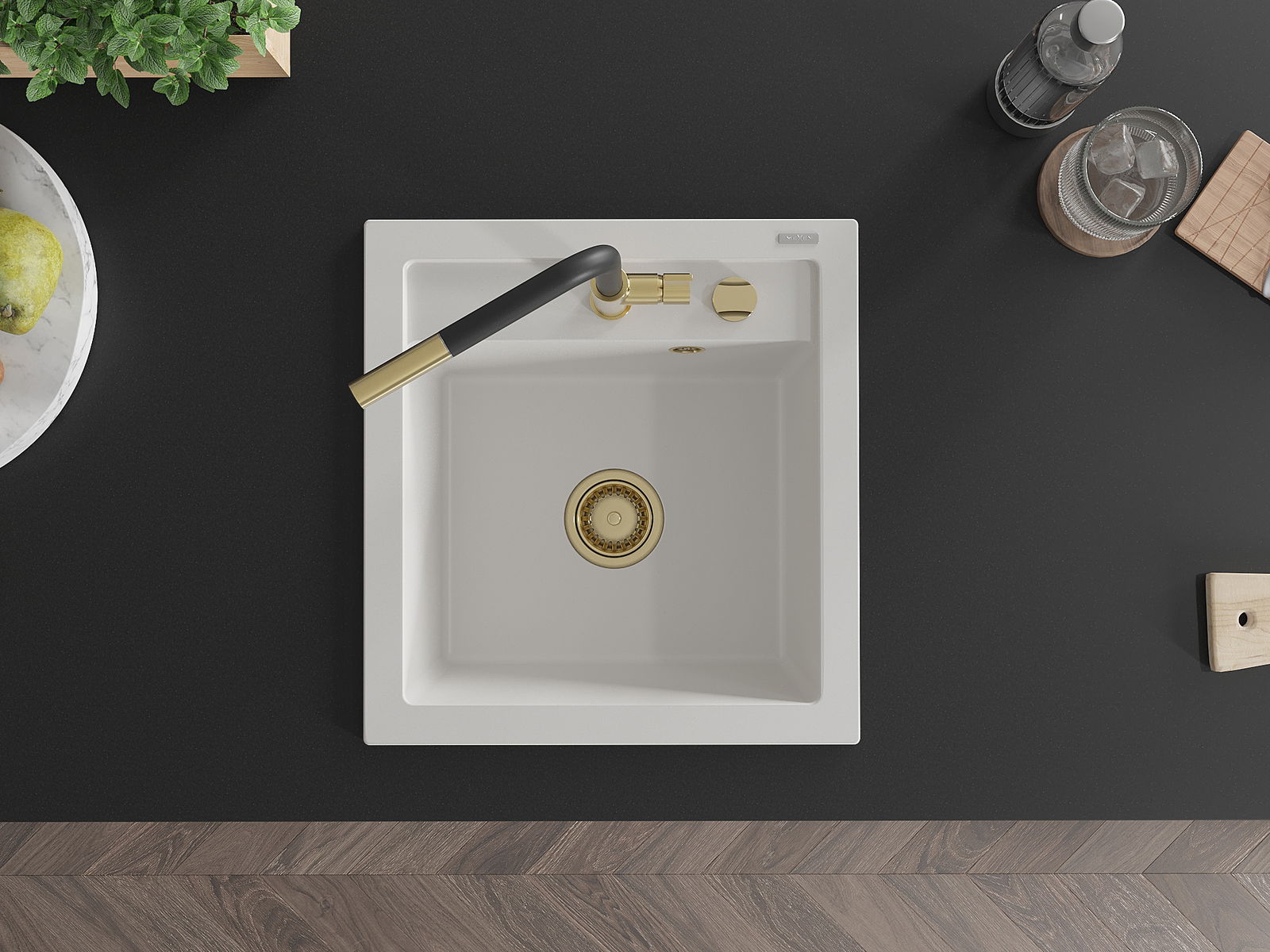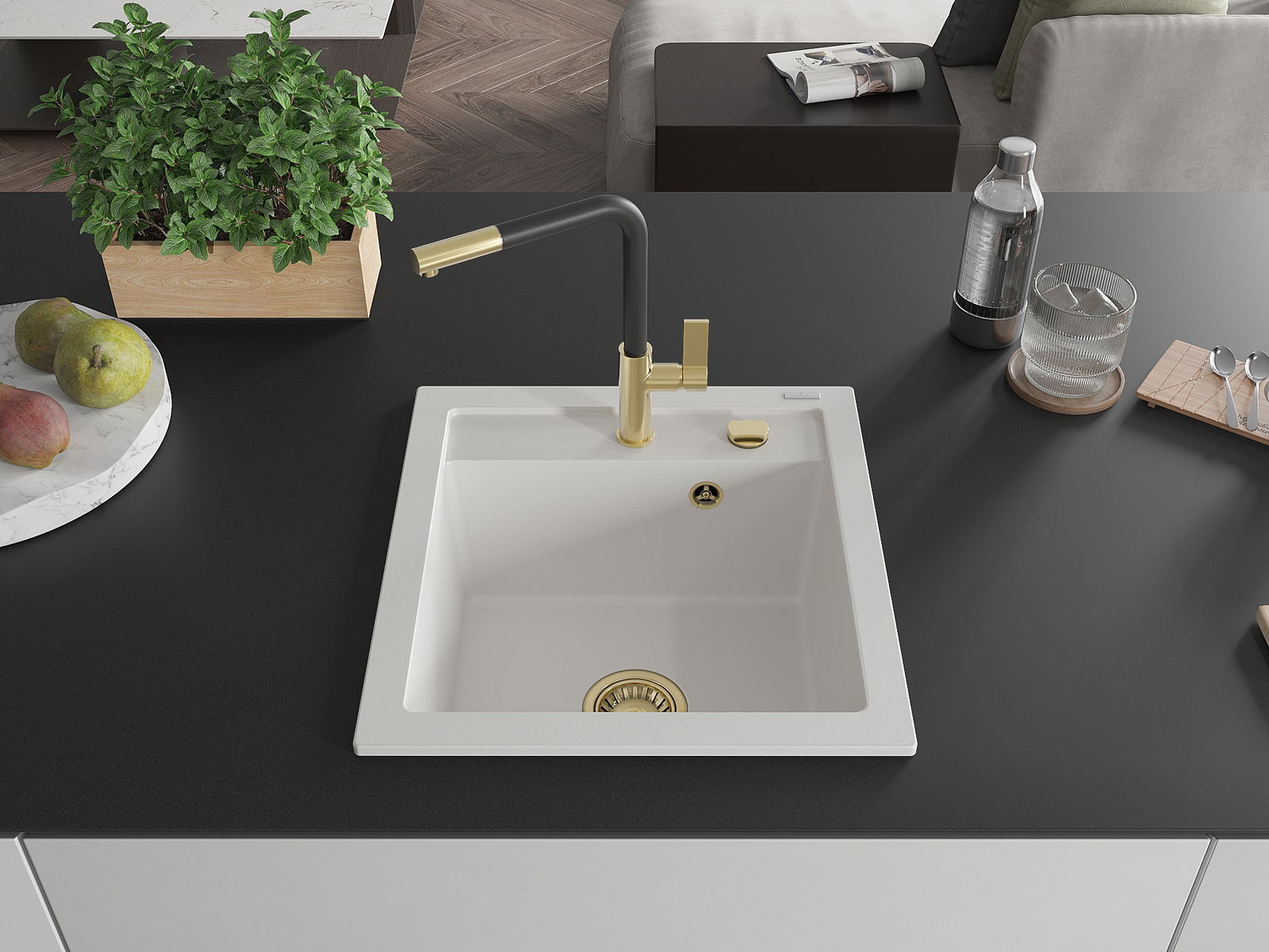 Mexen Vito granitinė vienos kameros plautuvė su Flora virtuviniu maišytuvu, balta - 6503-20-670401-57-G