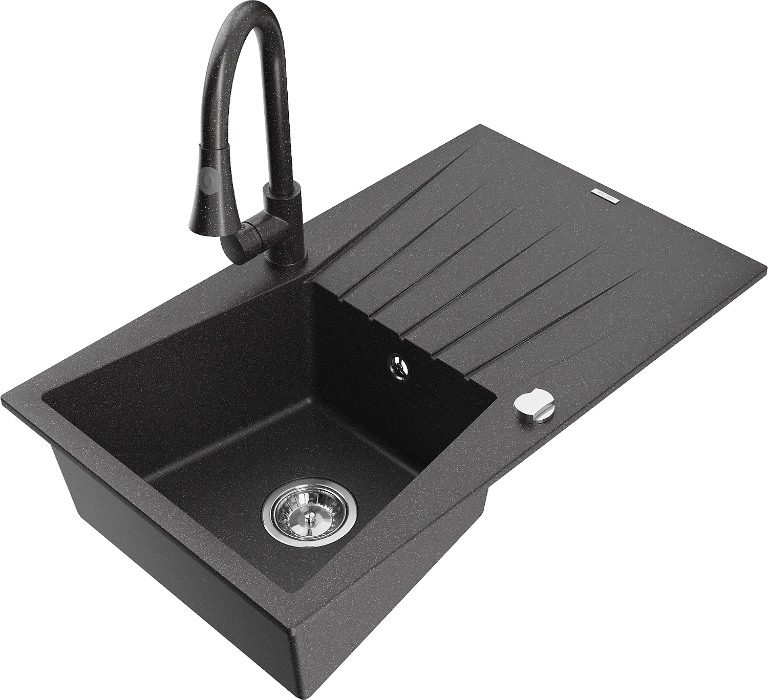 Mexen Cesar 1 kamerų granitinis plautuvės su nutekėjimu ir virtuvės maišytuvu Elia, juoda dėmėta - 6514-76-670101-76