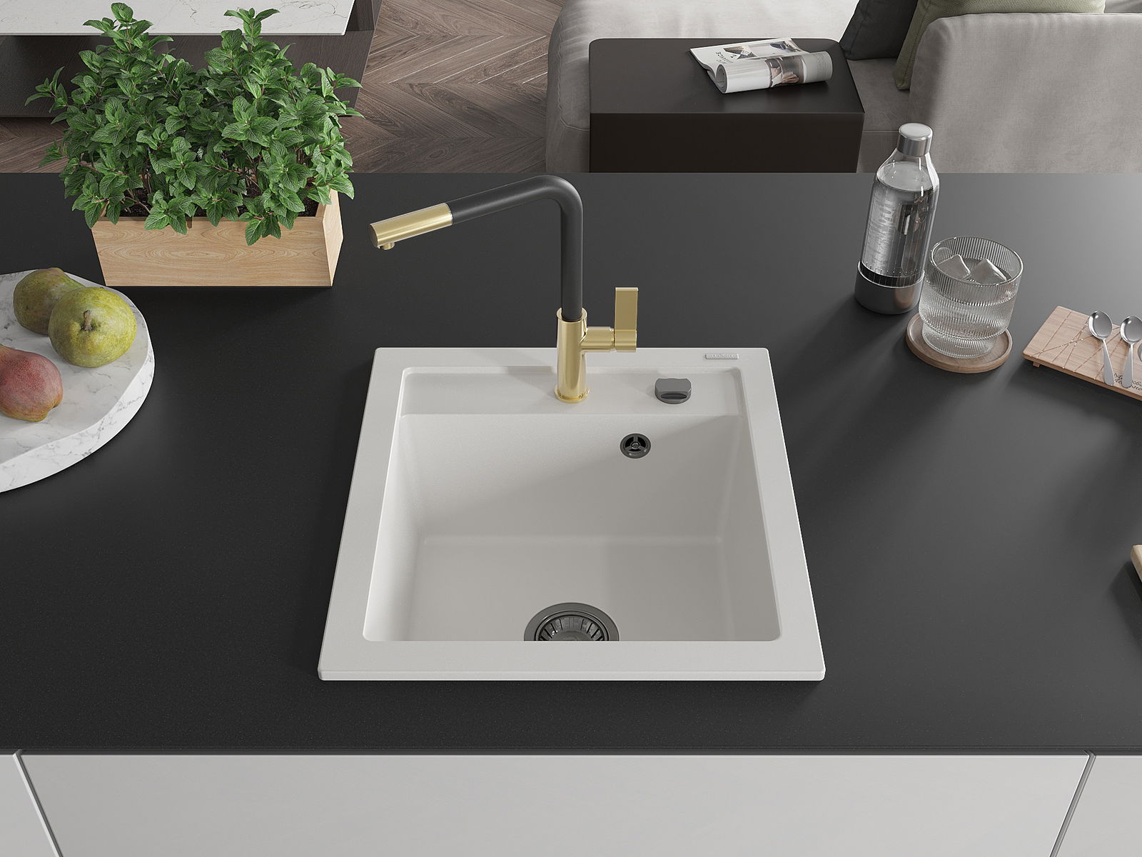 Mexen Vito granitinė vienos kameros plautuvė su virtuviniu maišytuvu Flora, balta - 6503-20-670401-57-B