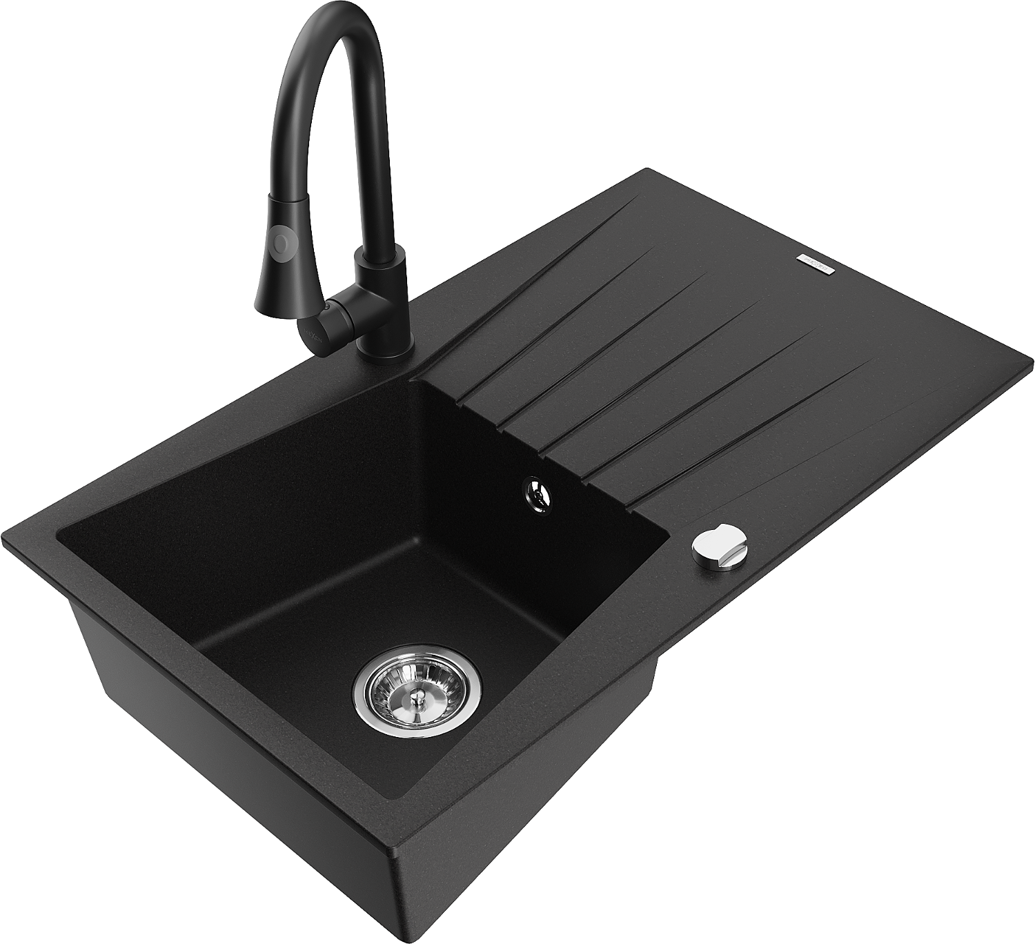 Mexen Cesar granito kriauklė su viena kamera, nuotaku ir maišytuvu Elia, juoda - 6514-77-670101-70