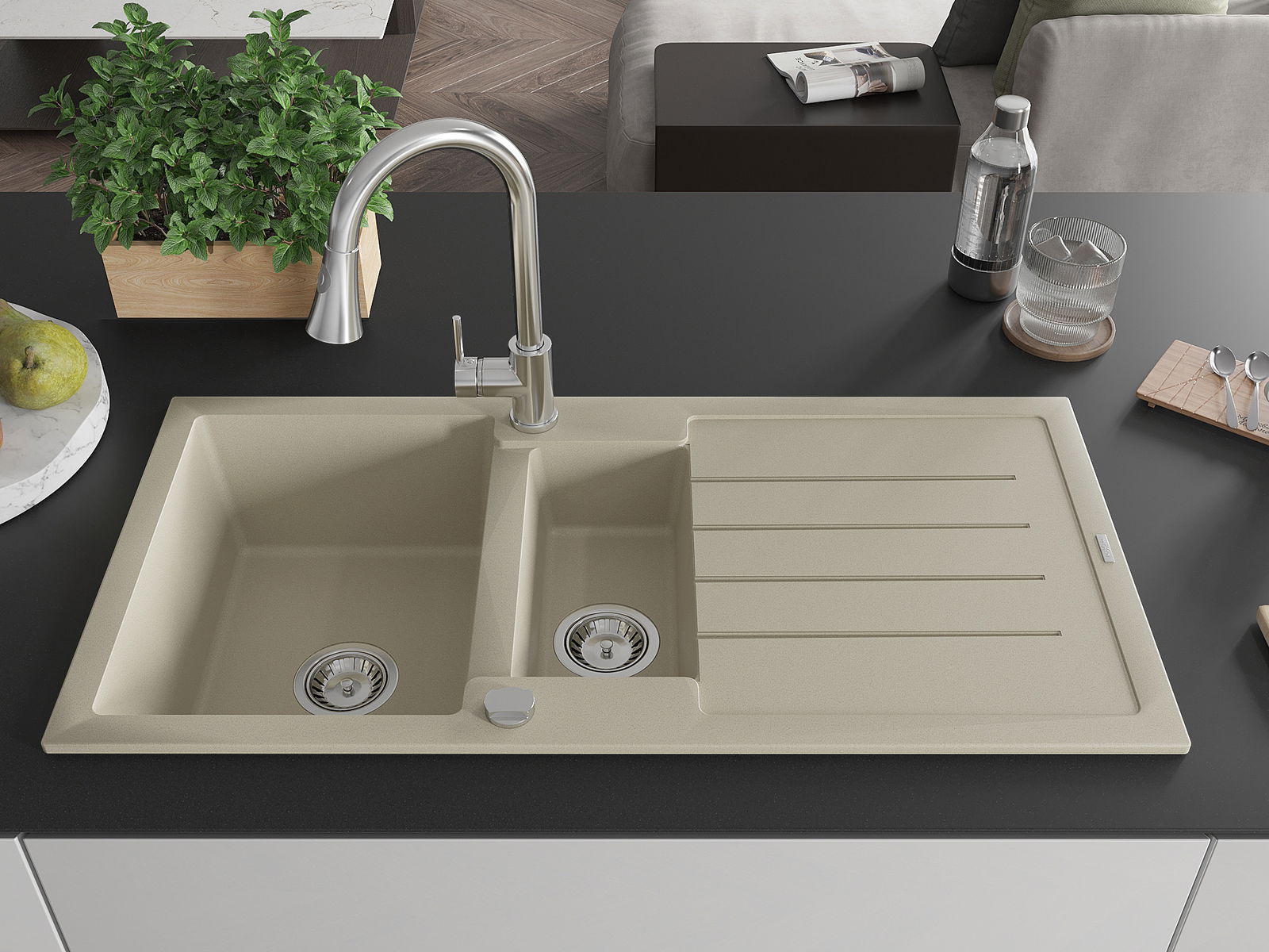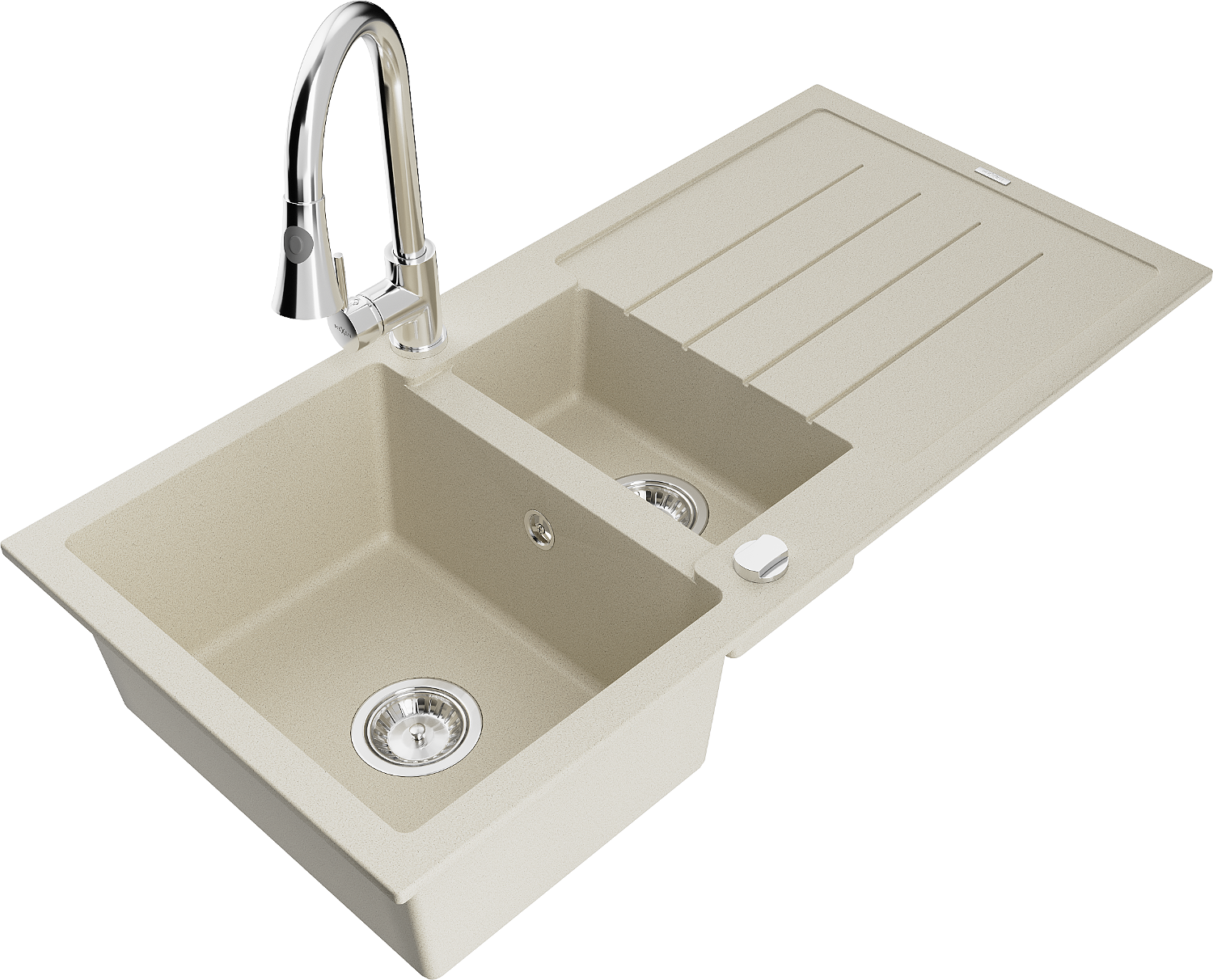 Mexen Andres granito plautuvė 1,5 skylių su nutekėjimu ir virtuvės maišytuvu Elia, smėlio spalvos - 6515-69-670101-00