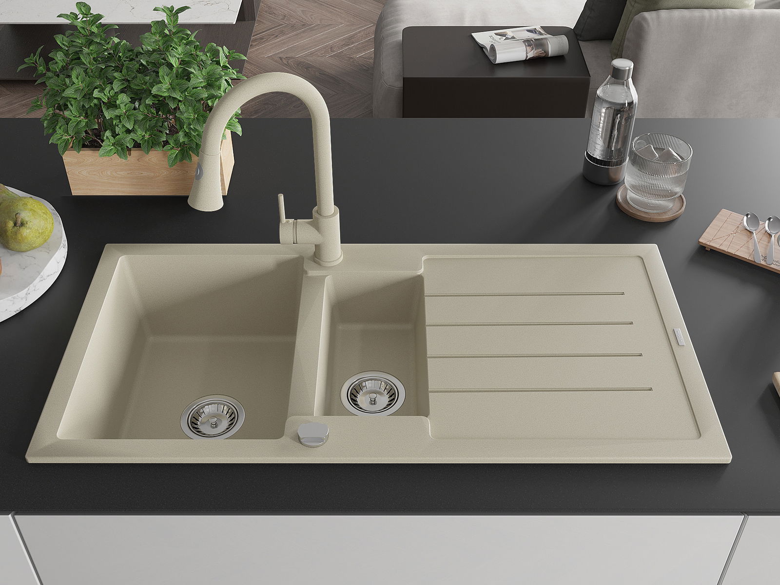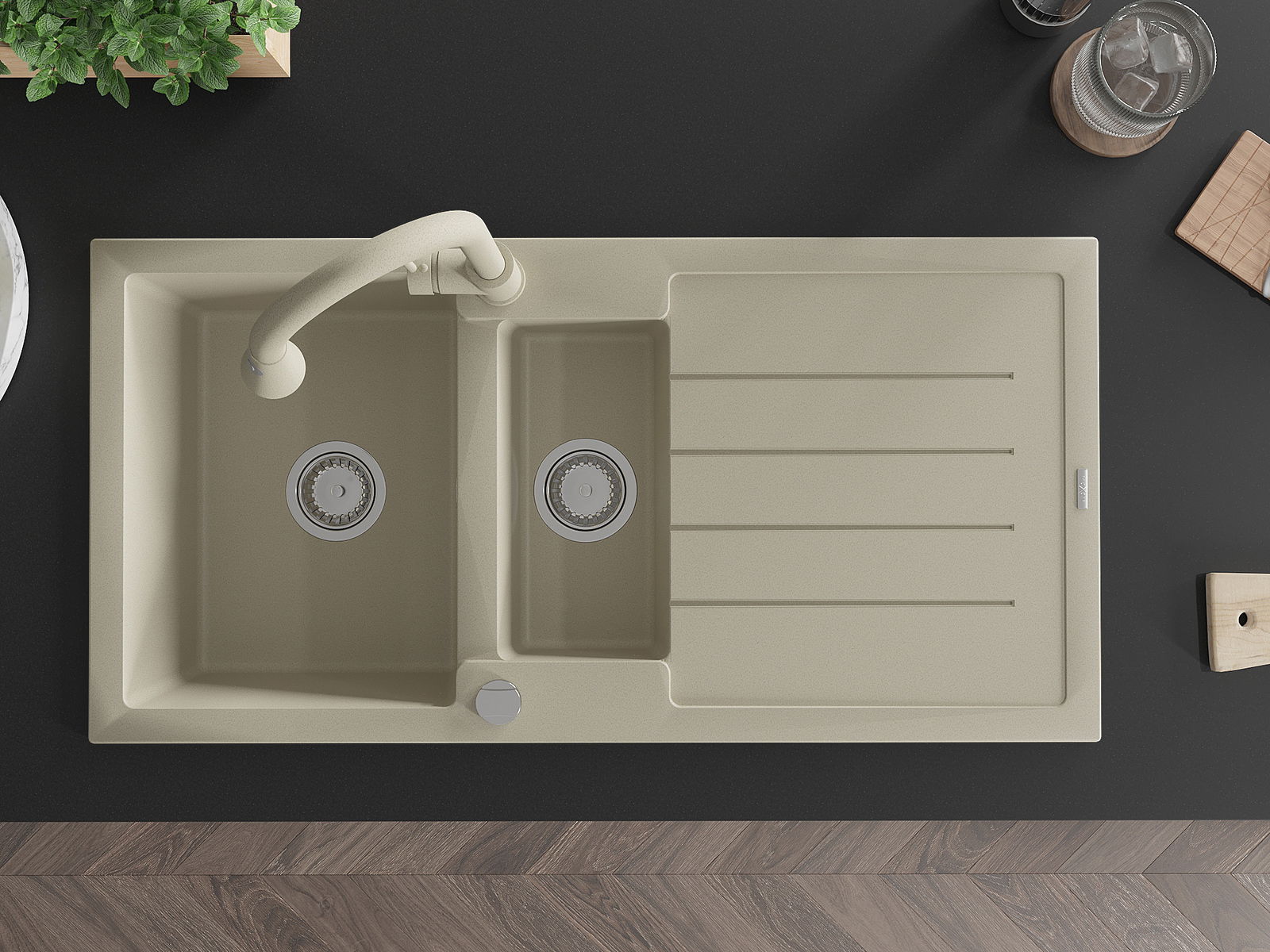 Mexen Andres akmens masės kriauklė 1,5 kamerų su lašėjimo zona ir virtuviniu maišytuvu Elia, smėlio spalvos - 6515-69-670101-69
