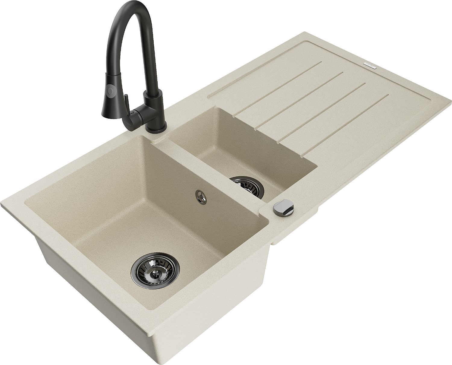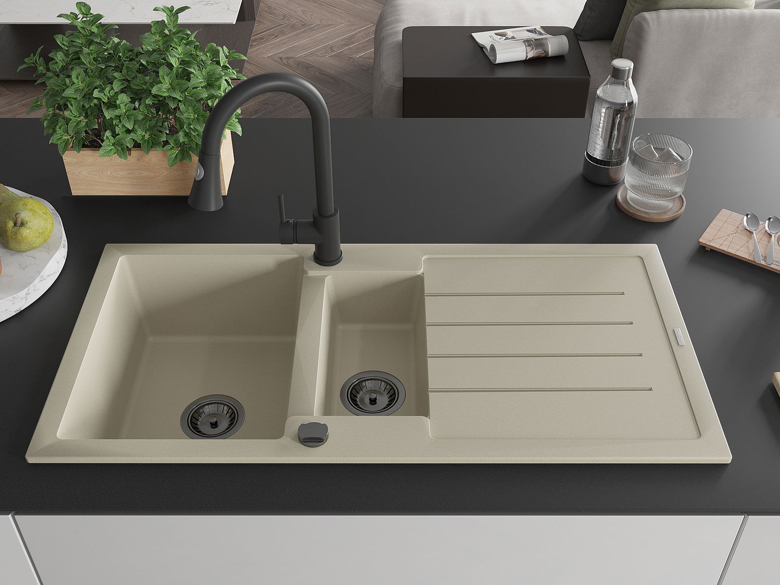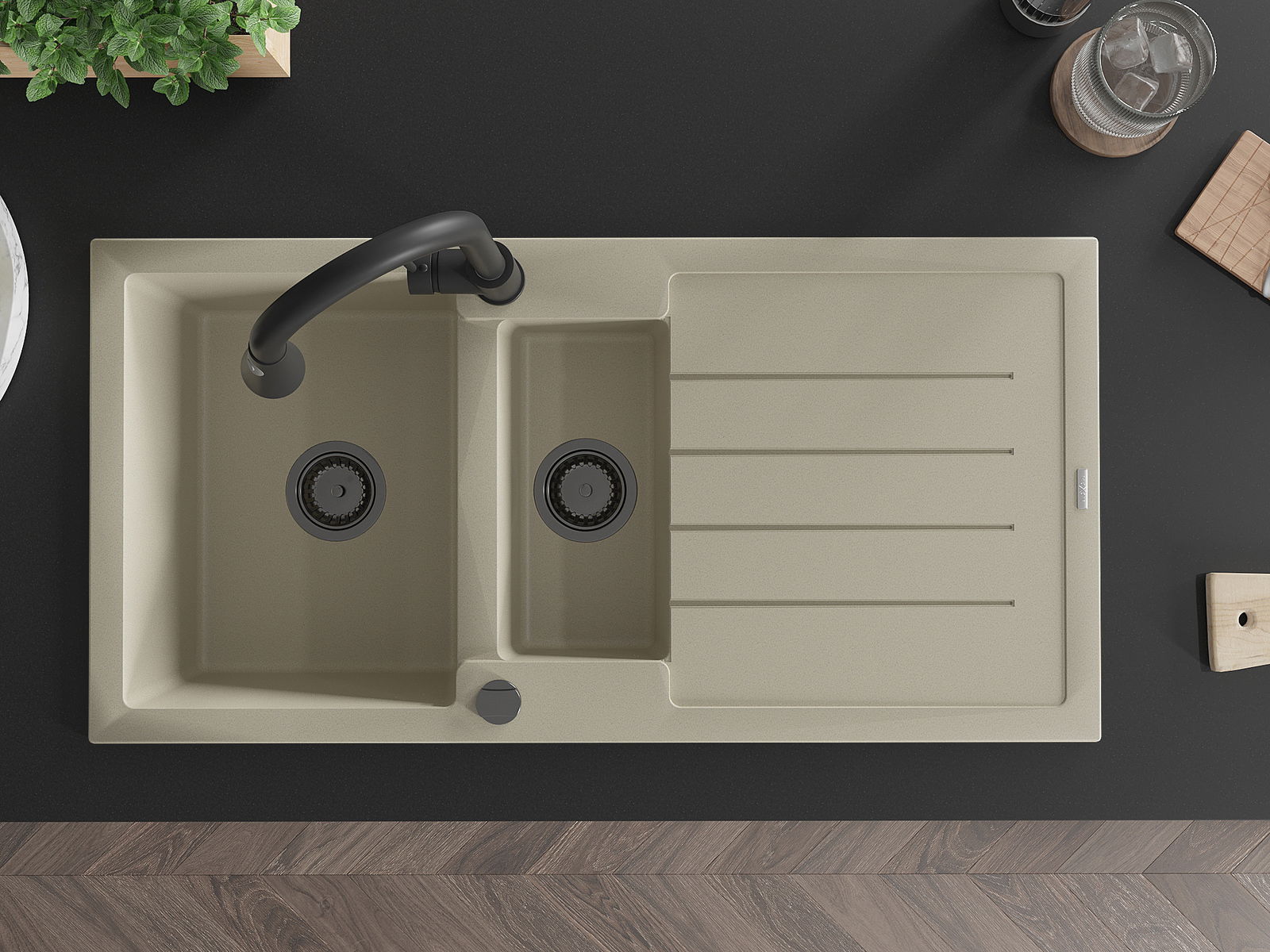 Mexen Andres granitinė 1,5 skylių plautuvė su nusausintuvu ir virtuvės maišytuvu Elia, smėlio spalvos - 6515-69-670101-70
