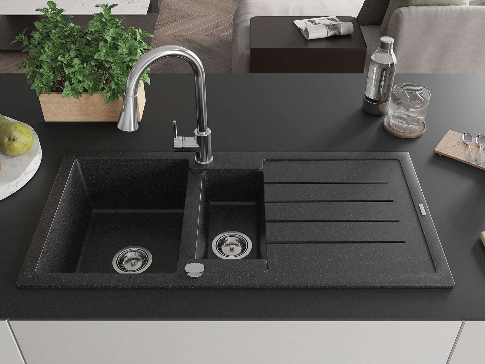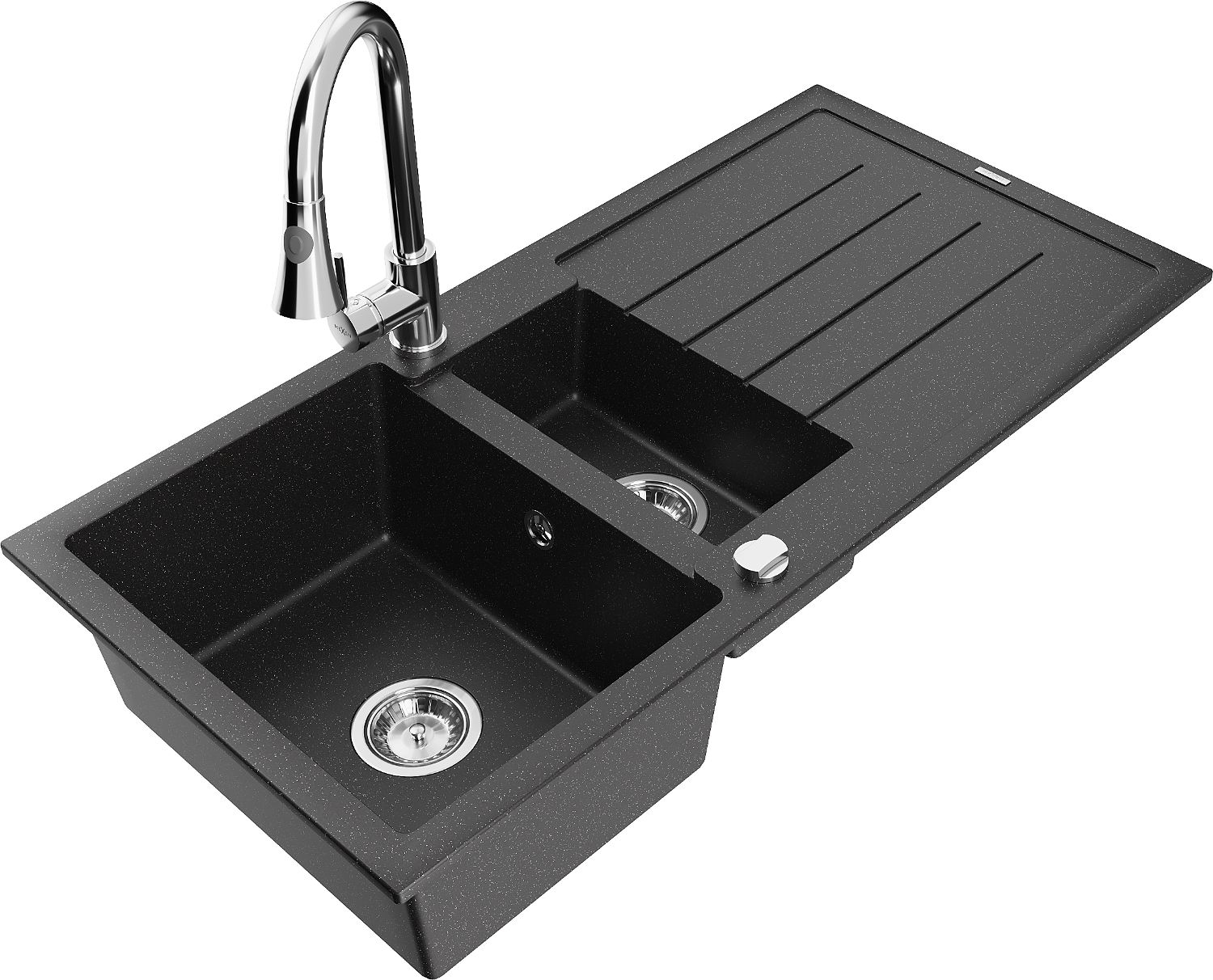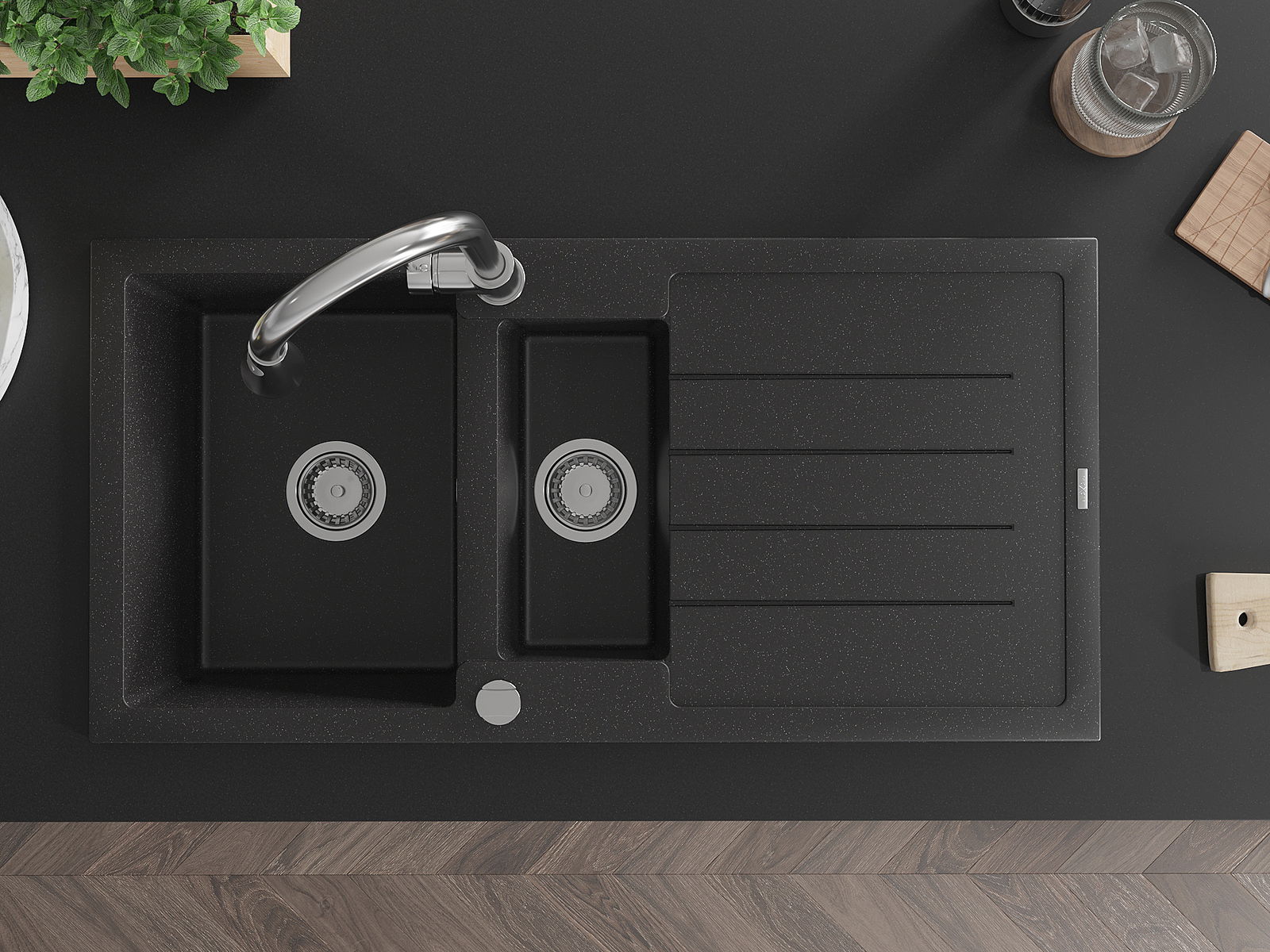Mexen Andres granitinė virtuvinė kriauklė su 1,5 skyreliais, lašėjimo plokštuma ir Elia virtuviniu maišytuvu,