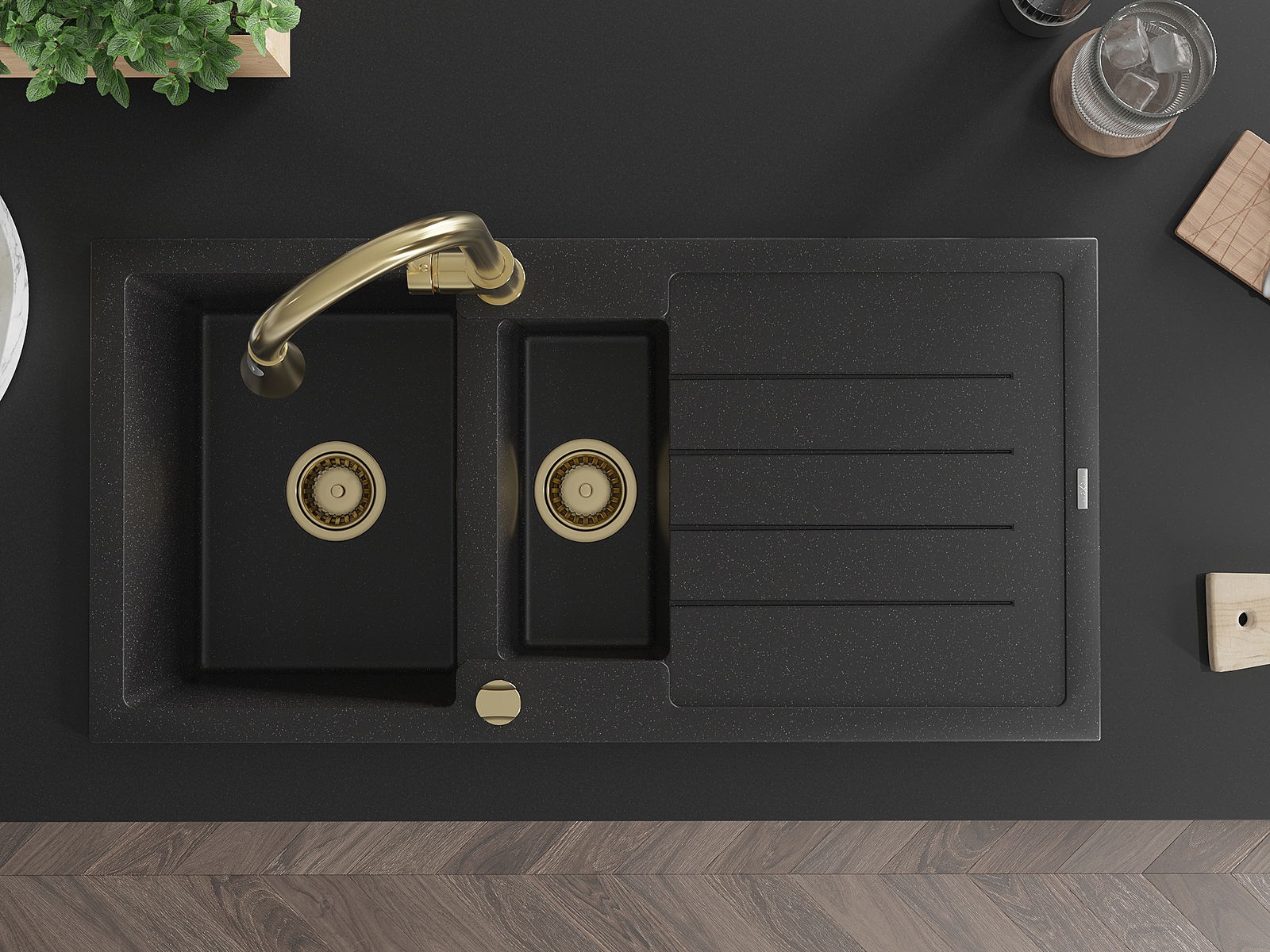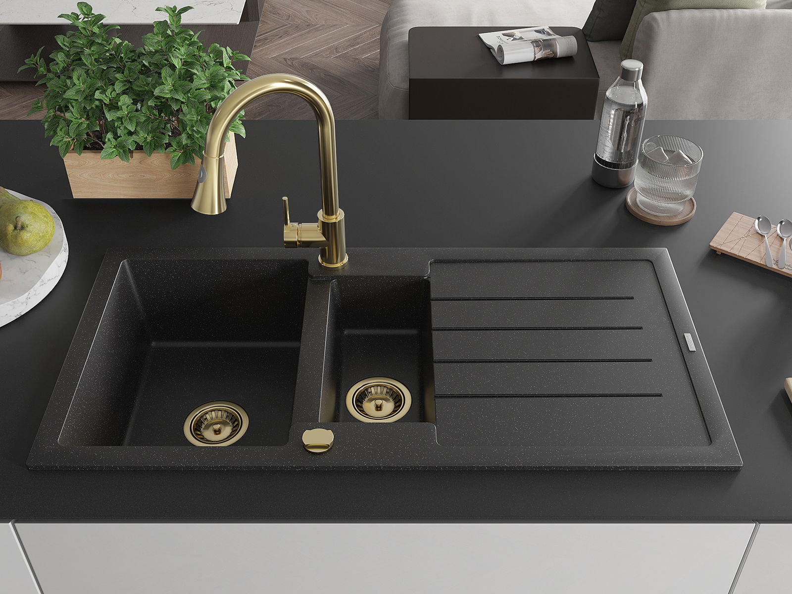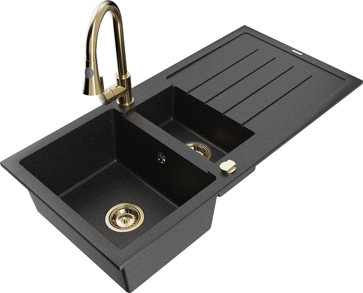 Mexen Andres granitinė plautuvė 1,5 skyrių su nusausinimo zona ir virtuviniu maišytuvu Elia, juoda/sidabrinė metalika