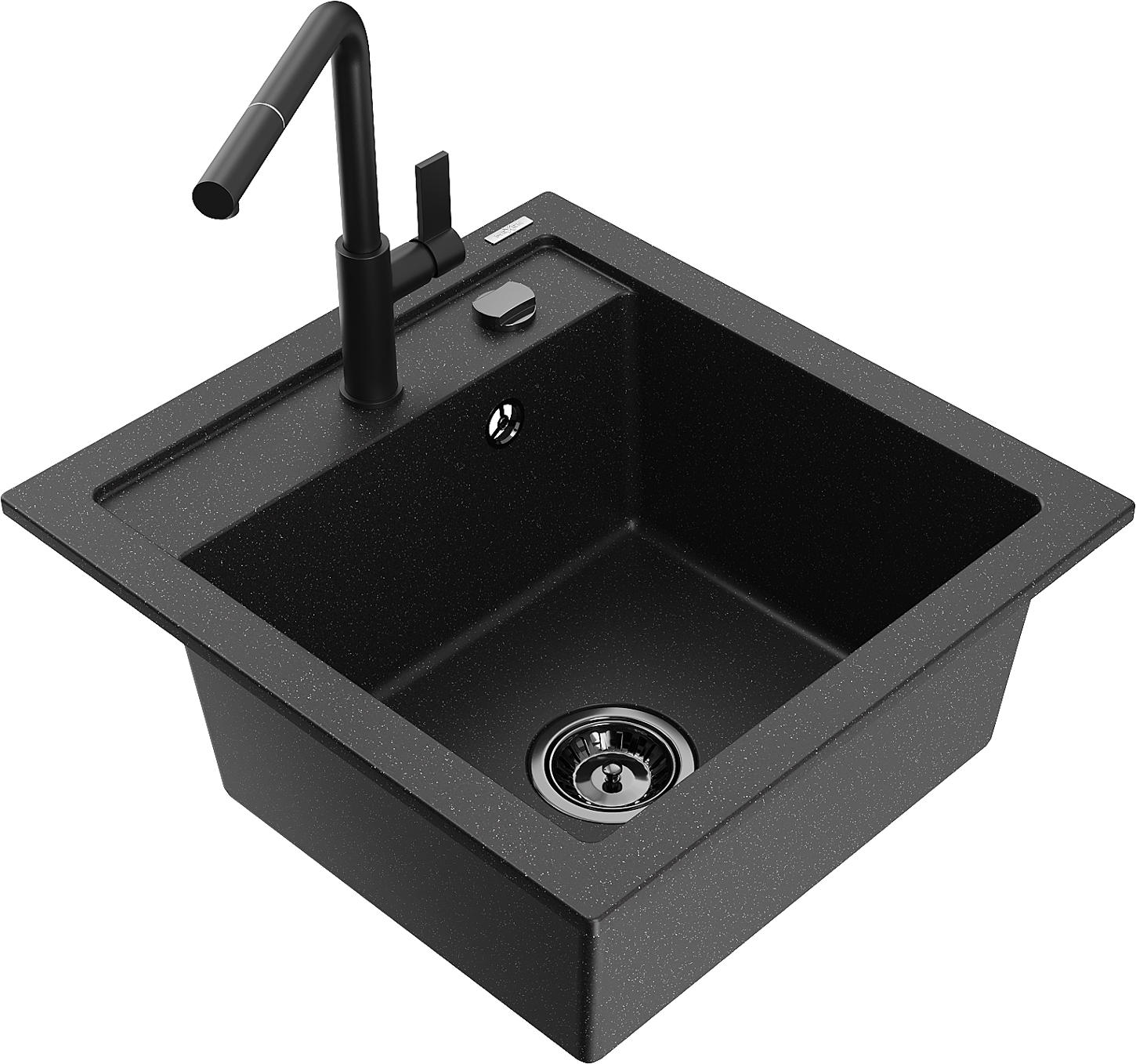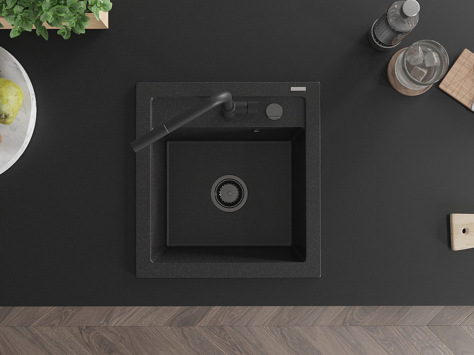 Mexen Vito granitinė plautuvė su viena kamera ir Flora virtuvės maišytuvu, juoda/sidabrinis metalikas - 6503-73-670401-70-B