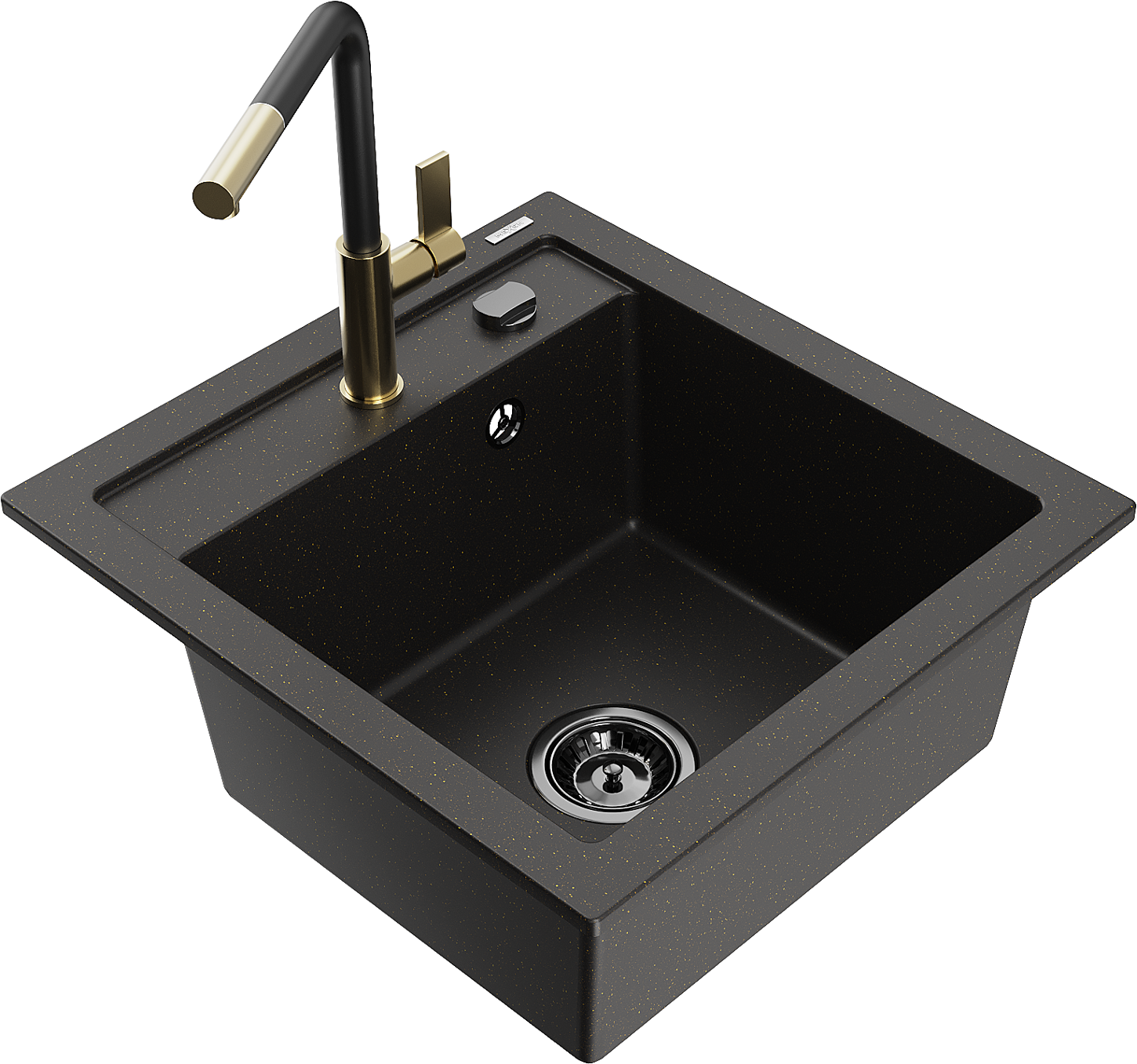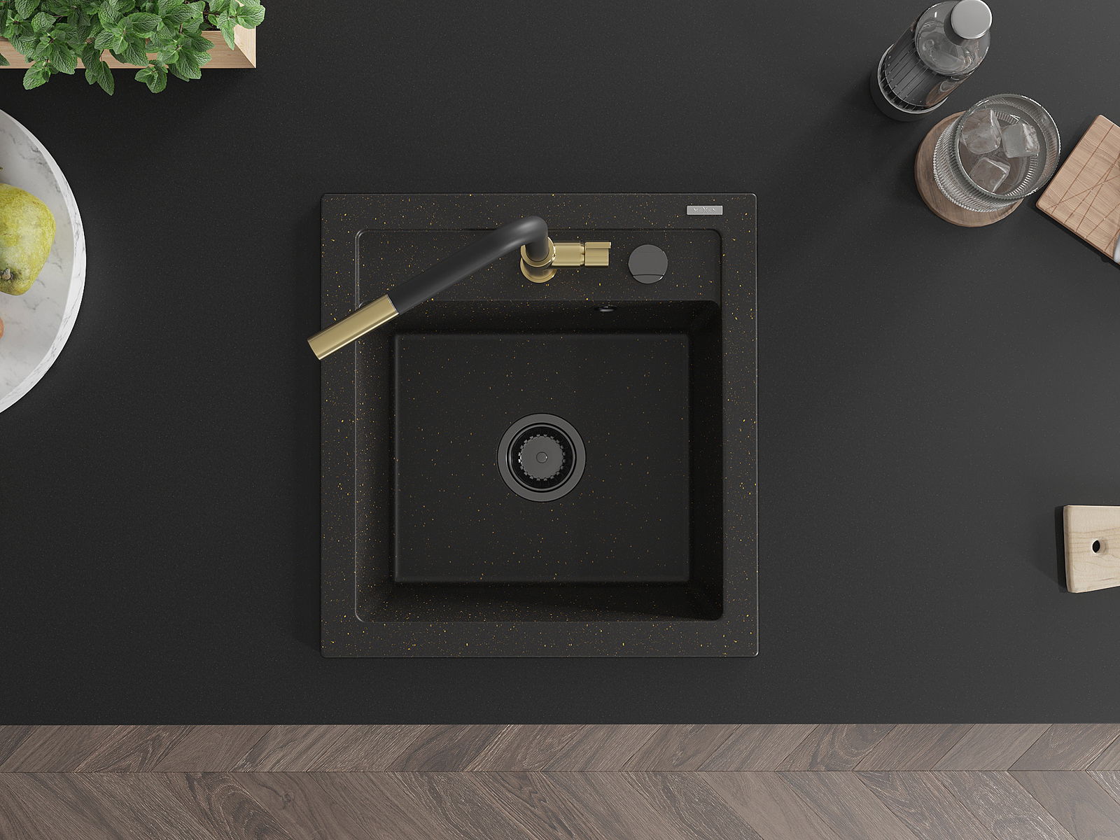 Mexen Vito vienos kameros granito kriauklė su Flora virtuviniu maišytuvu, juoda/auksinė metalik - 6503-75-670401-57-B