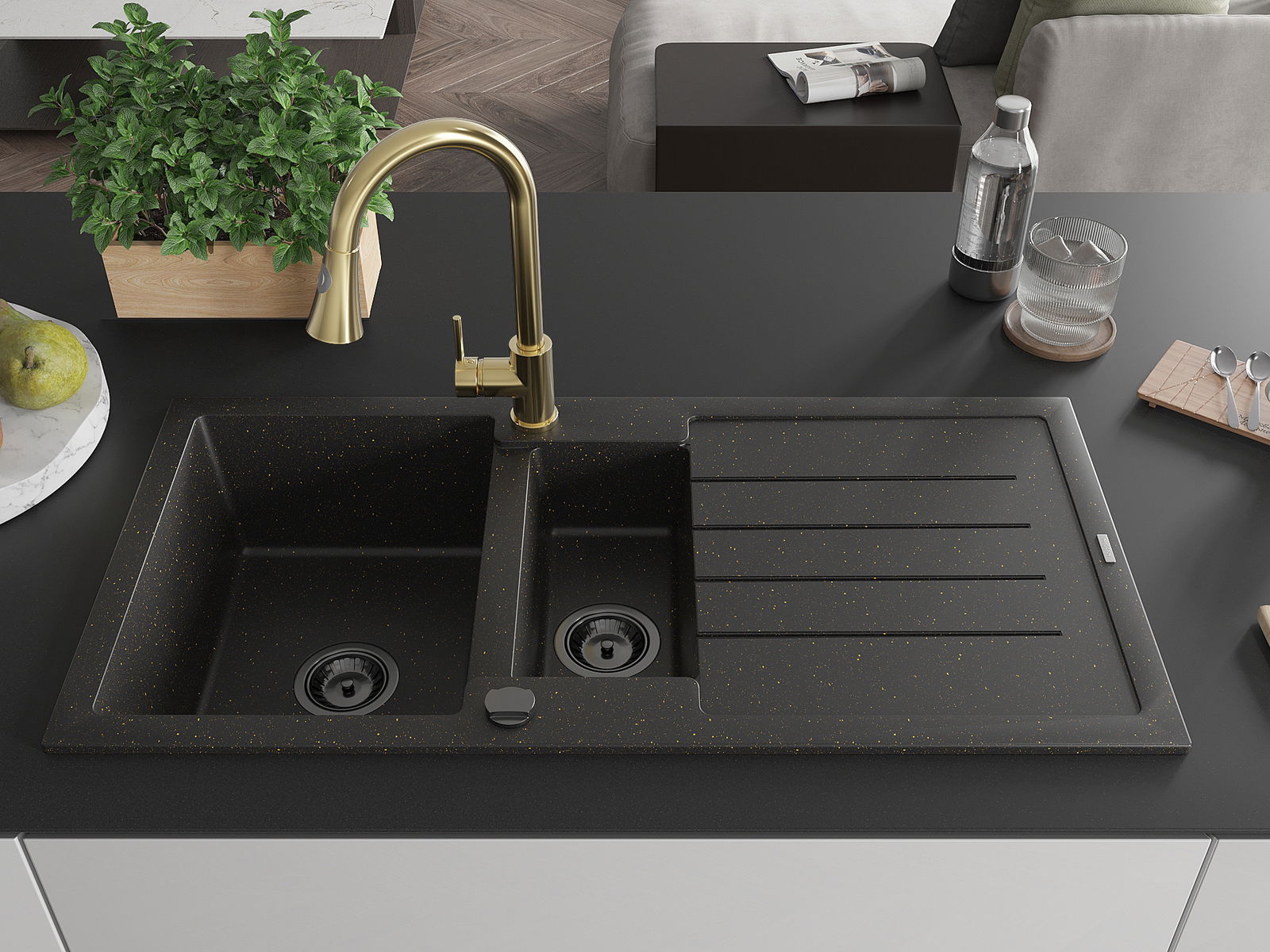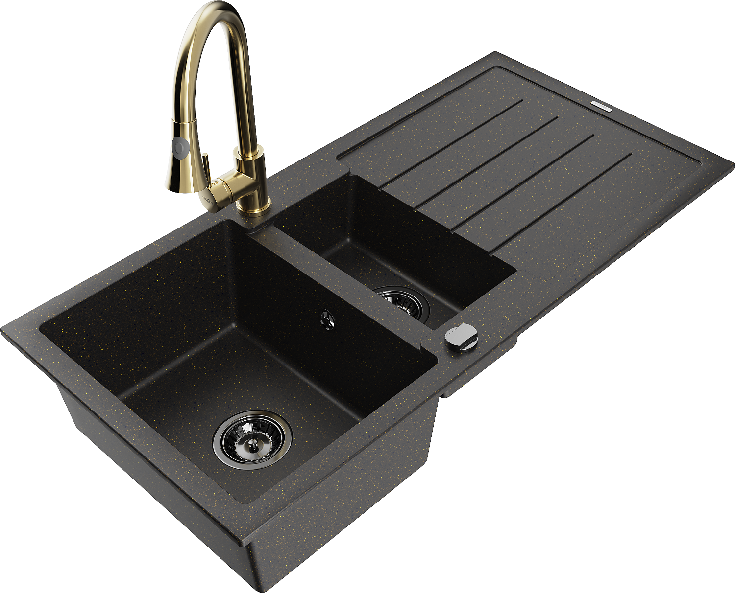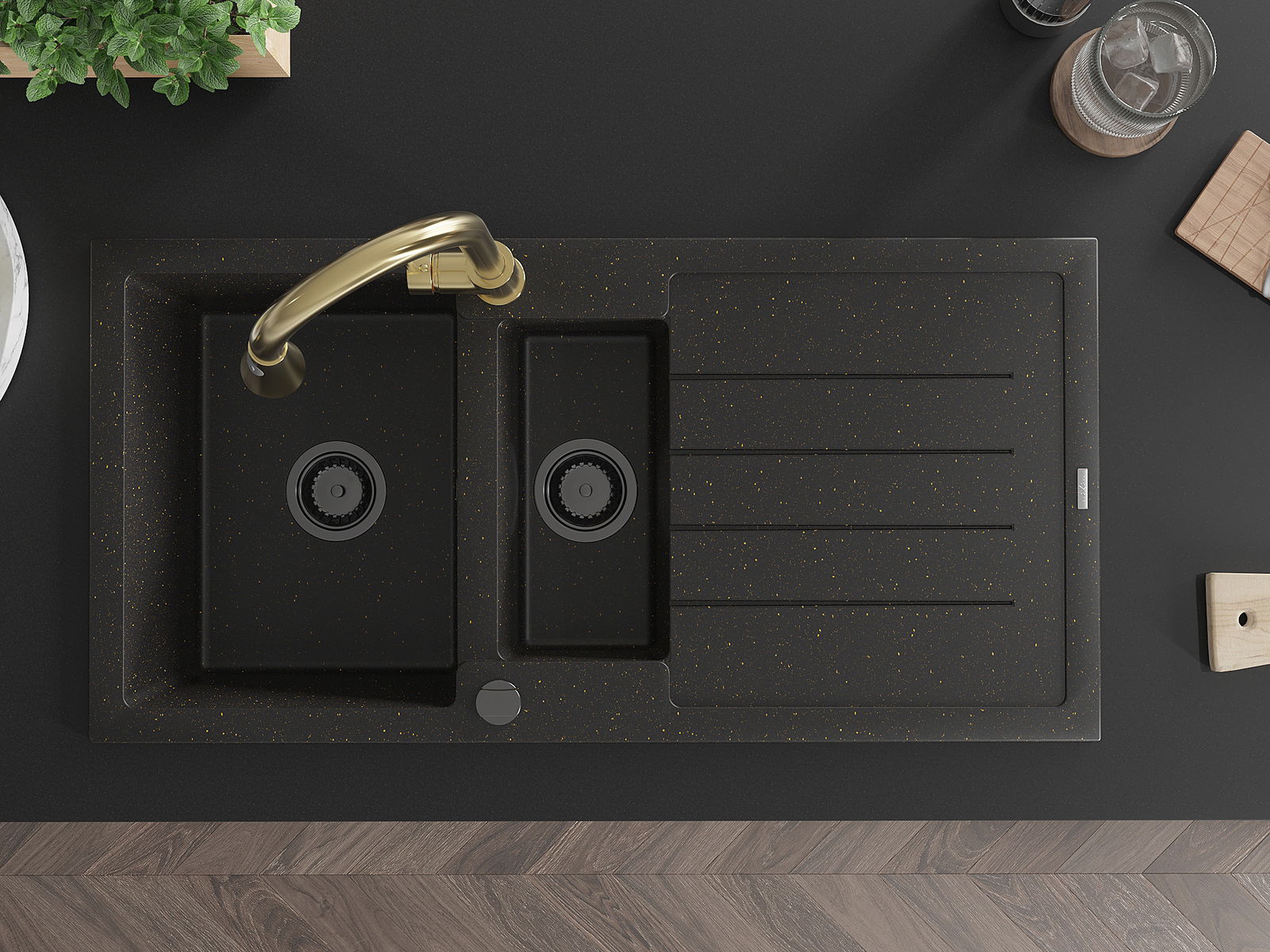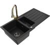 Mexen Andres 1,5 tarnų granitinė kriauklė su nutekėjęs ir virtuves maišytuvu Elia, juoda/auksinis metalikas