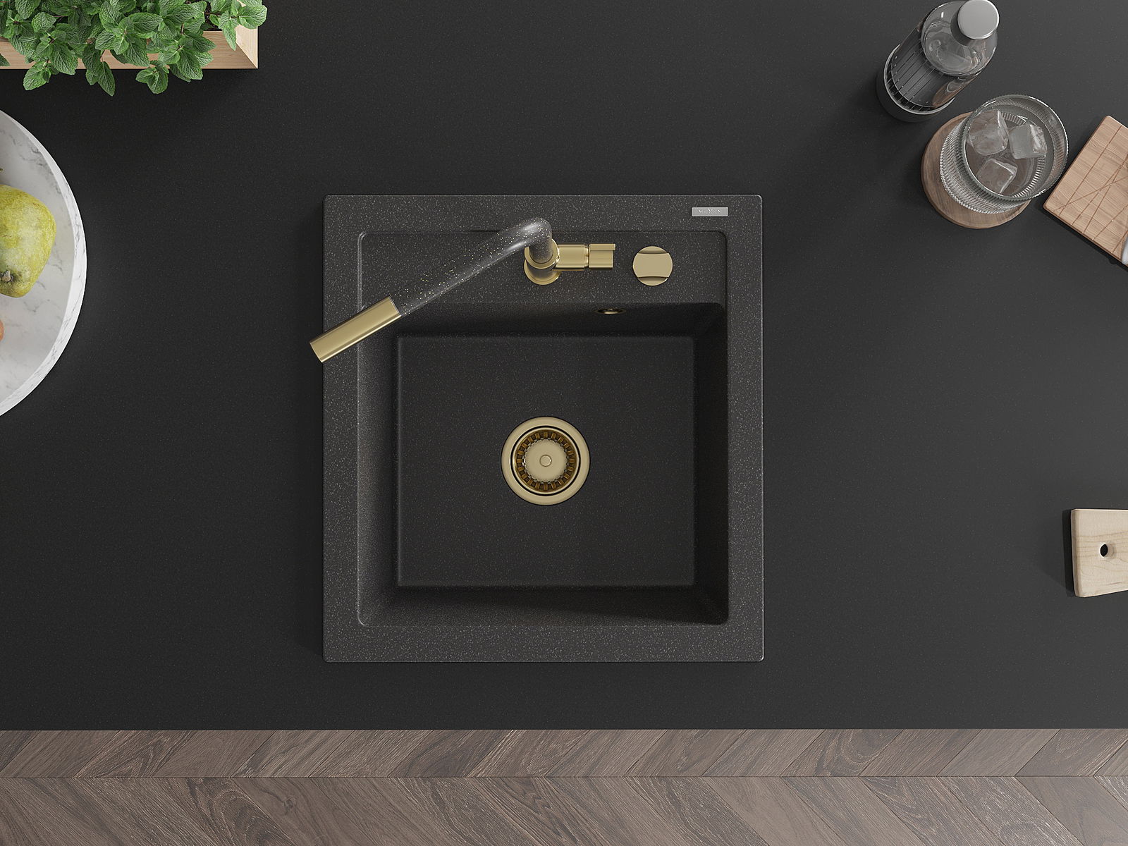 Mexen Vito granitinis vienos talpos virtuvės plautuvė su Flora virtuvės maišytuvu, juoda su dėmelėmis - 6503-76-670401-75-G