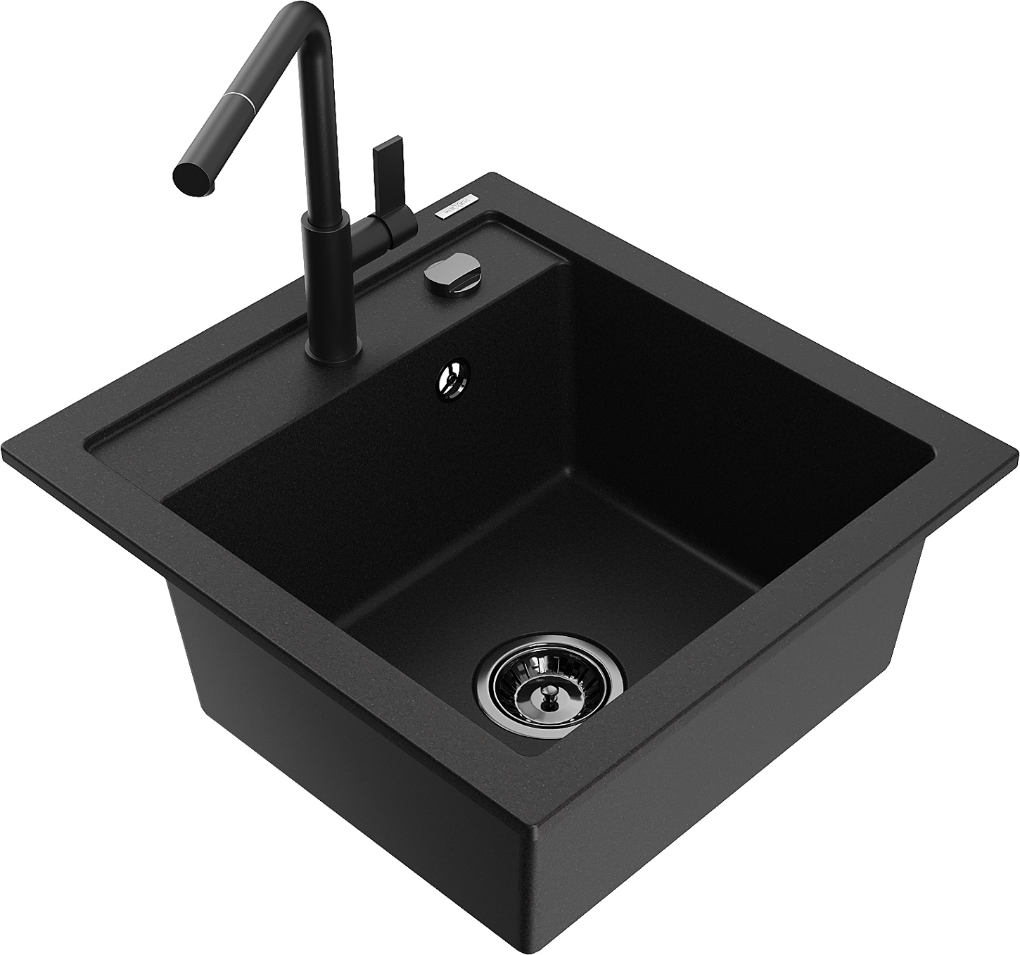 Mexen Vito vienos kameros granitinė virtuvės kriauklė su Flora maišytuvu, juoda - 6503-77-670401-70-B