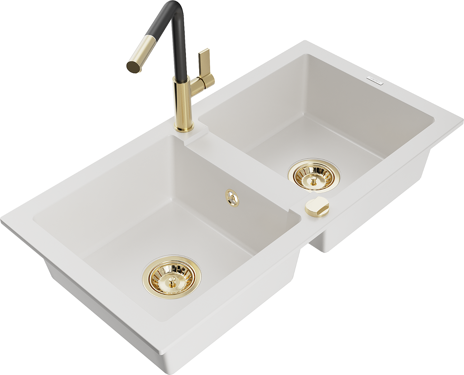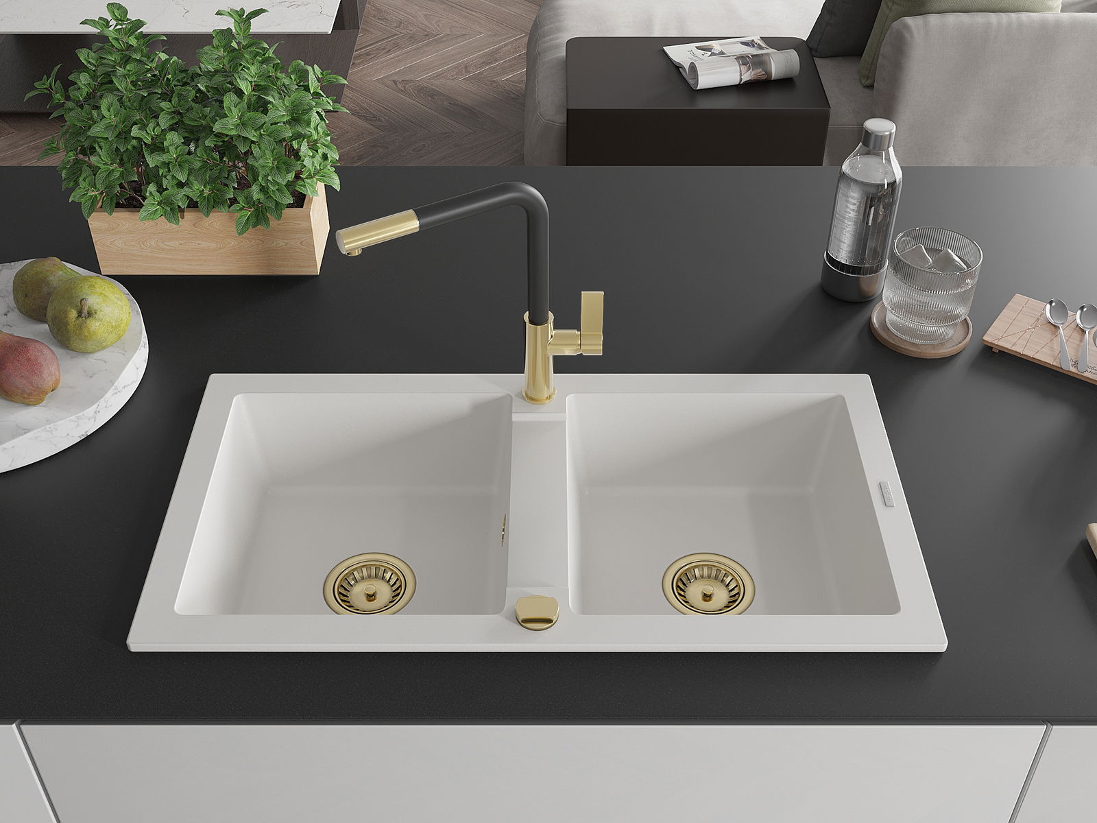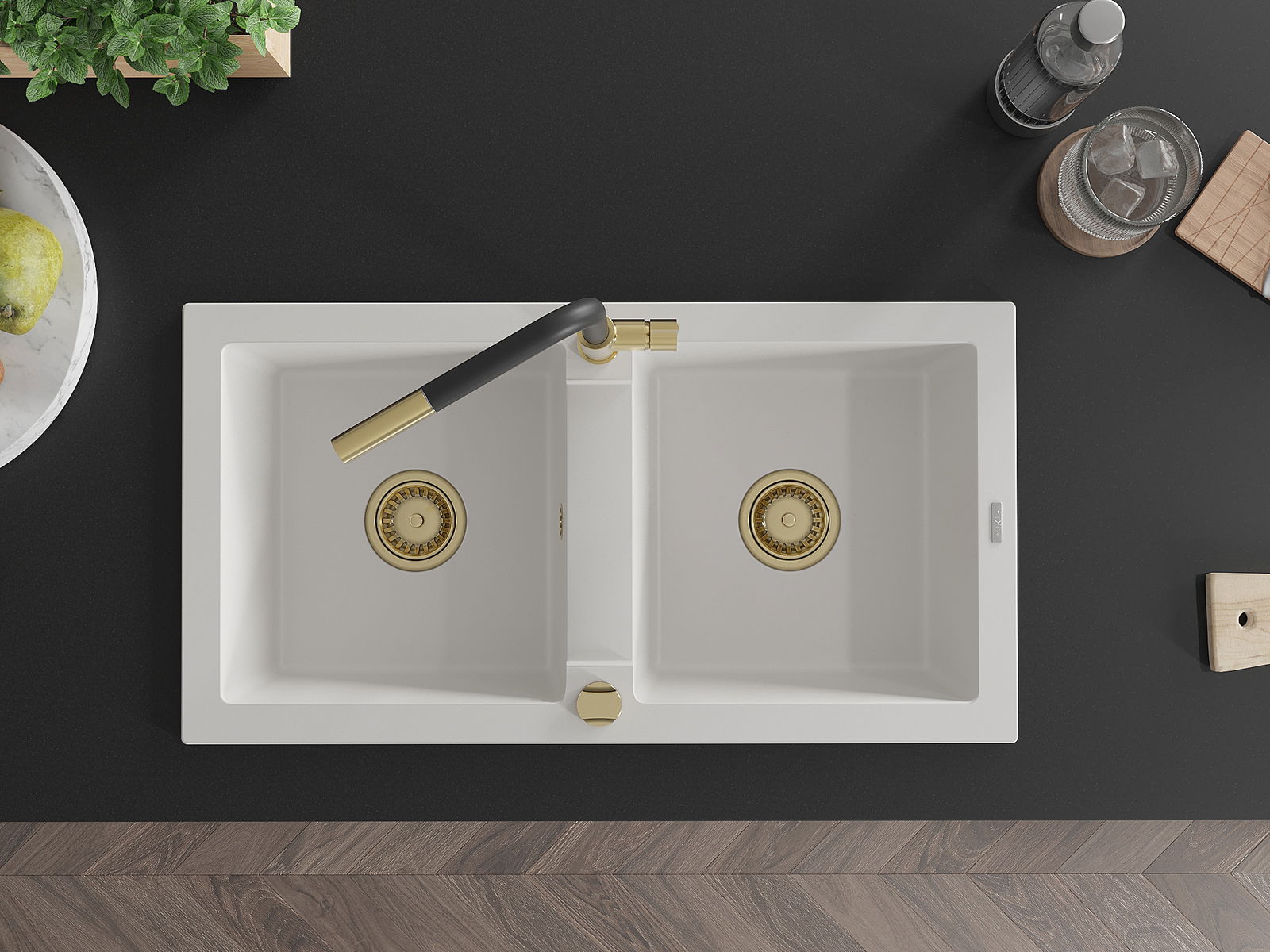 Mexen Mario granitinis dviejų skyrių virtuvės kriauklė su Flora maišytuvu, baltas - 6504-20-670401-57-G