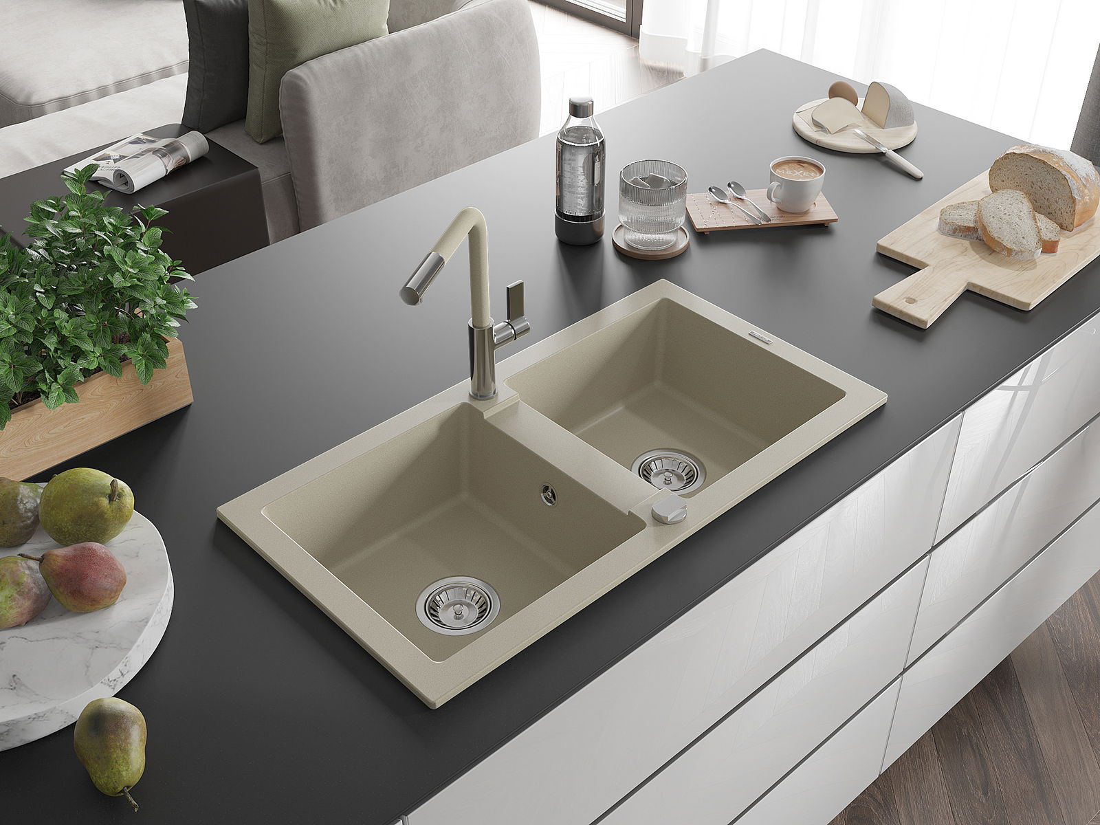 Kriauklės paviršius yra atsparūs dėmėms ir spalvos pasikeitimui, dėl kurio lengva valyti ir ilgą laiką išlaikyti savo spalvą. Estetinis ir praktiškai papildantis kiekvieną virtuvę.