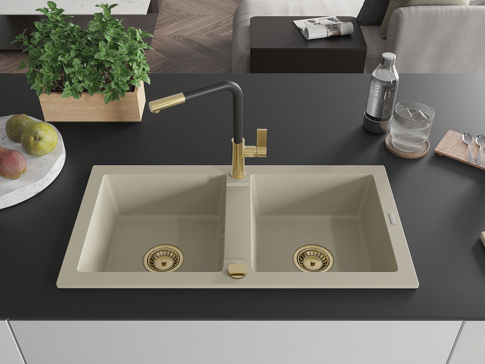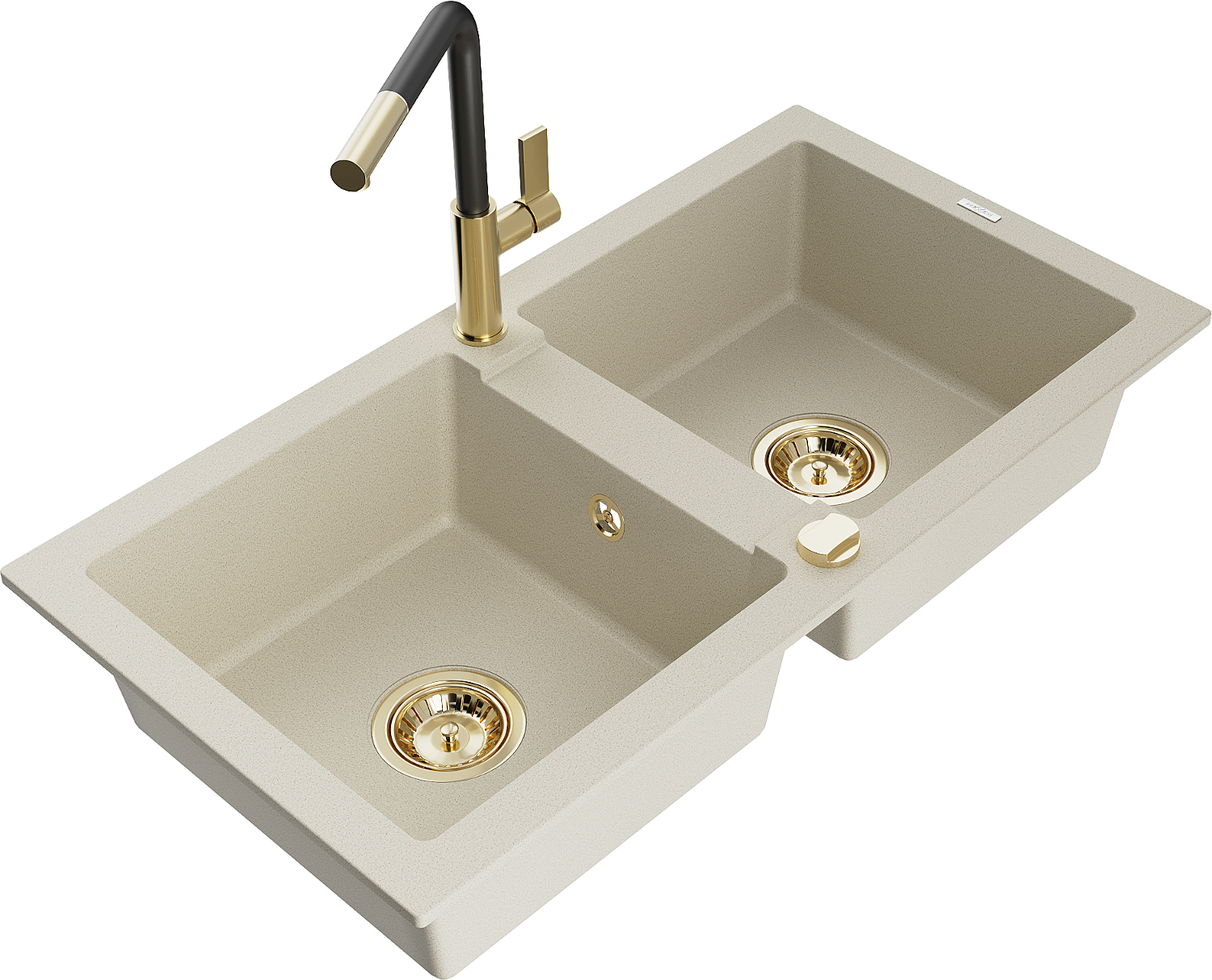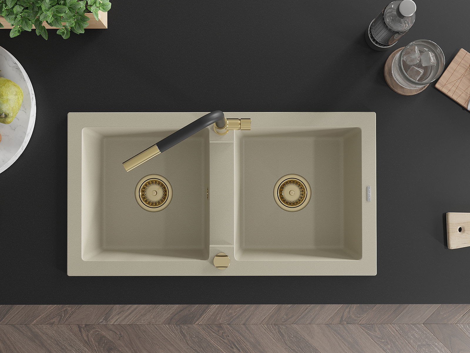 Mexen Mario granitinis dviejų skyrių plautuvas su virtuviniu maišytuvu Flora, smėlio spalvos - 6504-69-670401-57-G