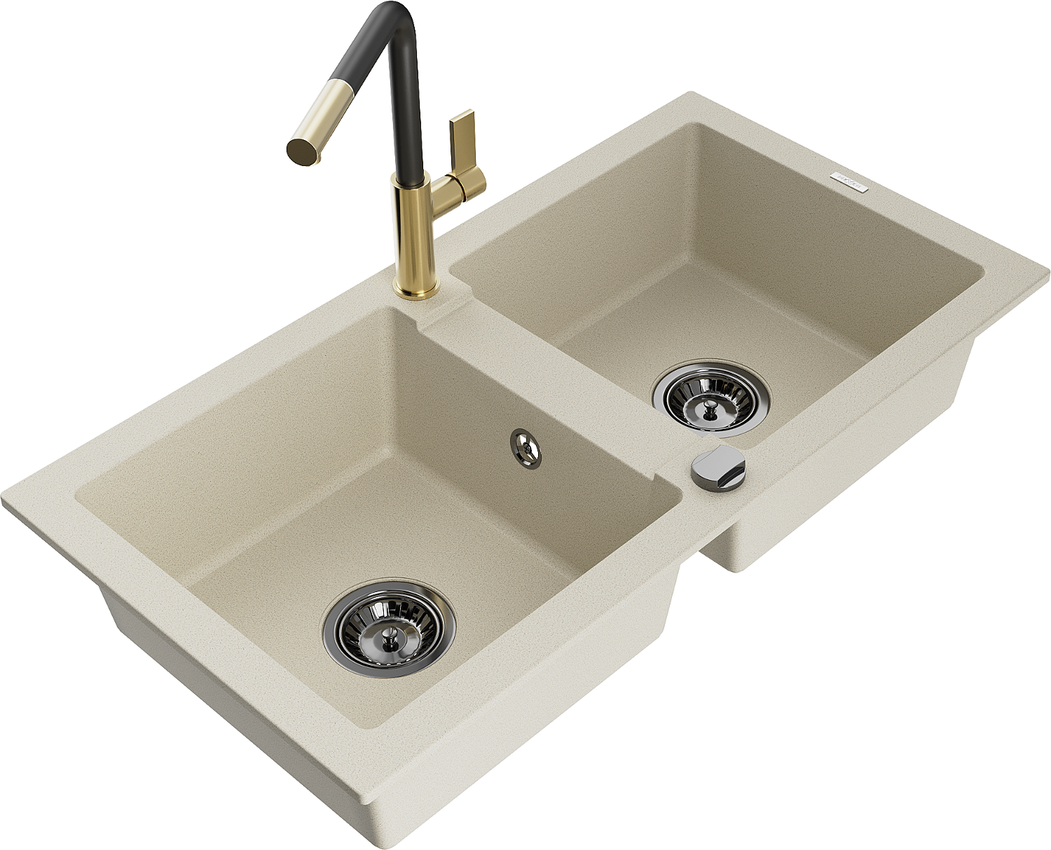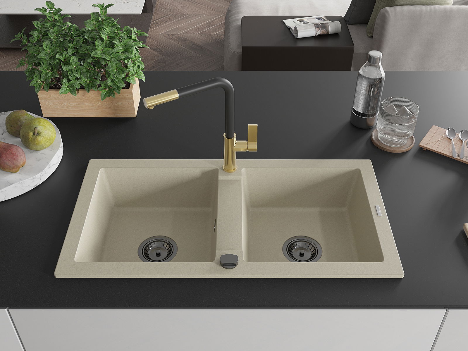 Mexen Mario granitinė virtuvės kriauklė su dviem kameromis su virtuvės maišytuvu Flora, smėlinis - 6504-69-670401-57-B