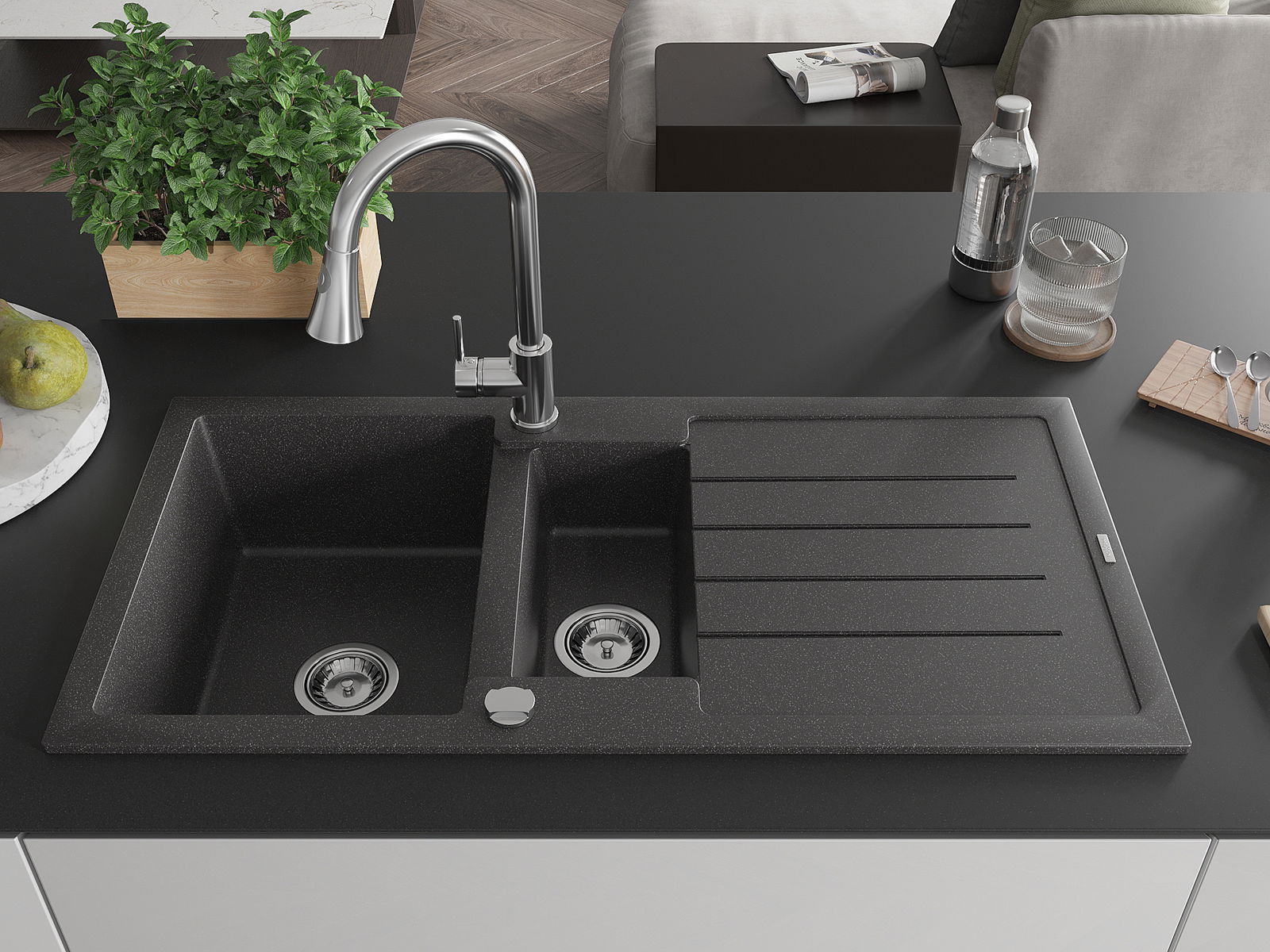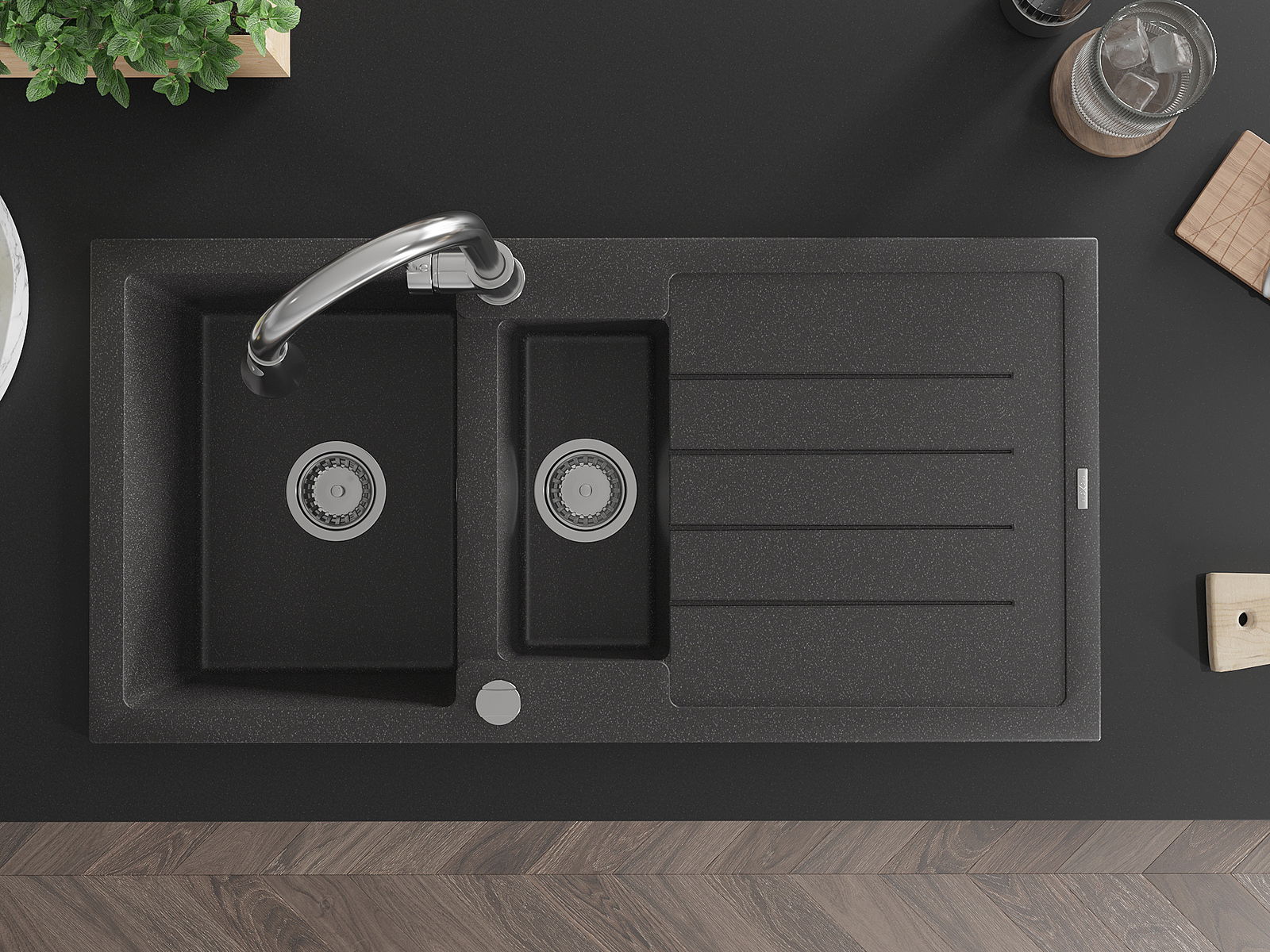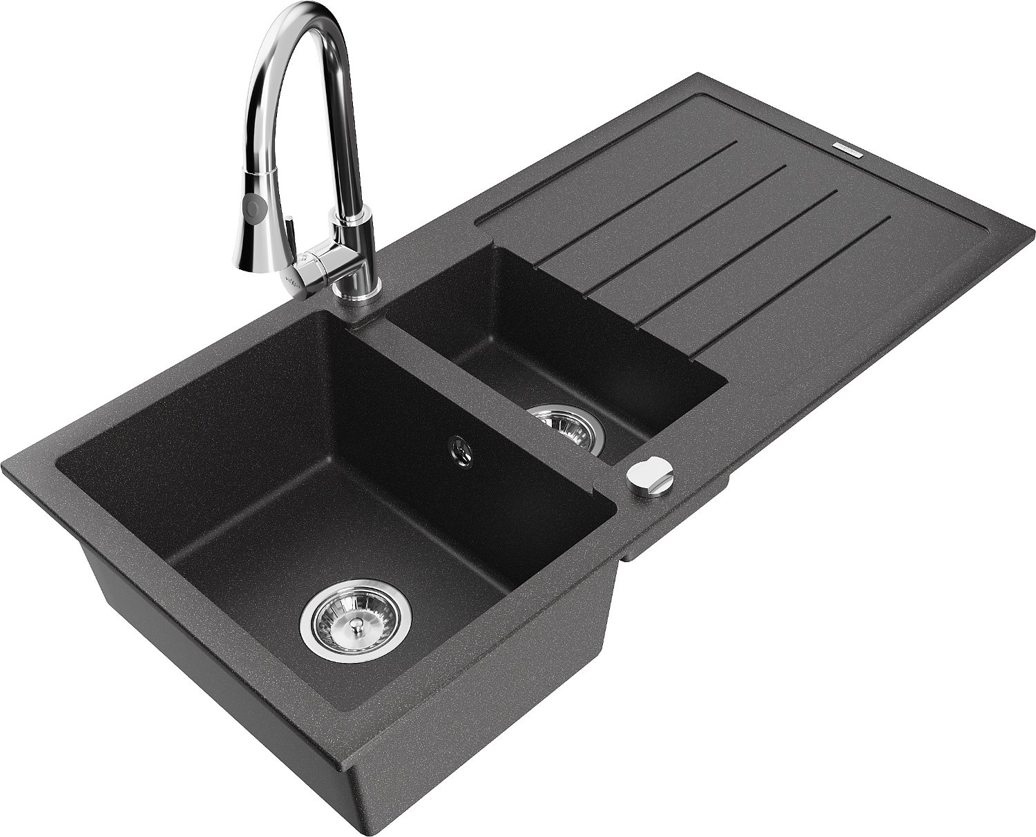 Mexen Andres granitinė 1,5 kamerų plautuvė su nuvarvėju ir virtuviniu maišytuvu Elia, juoda su dėmėmis