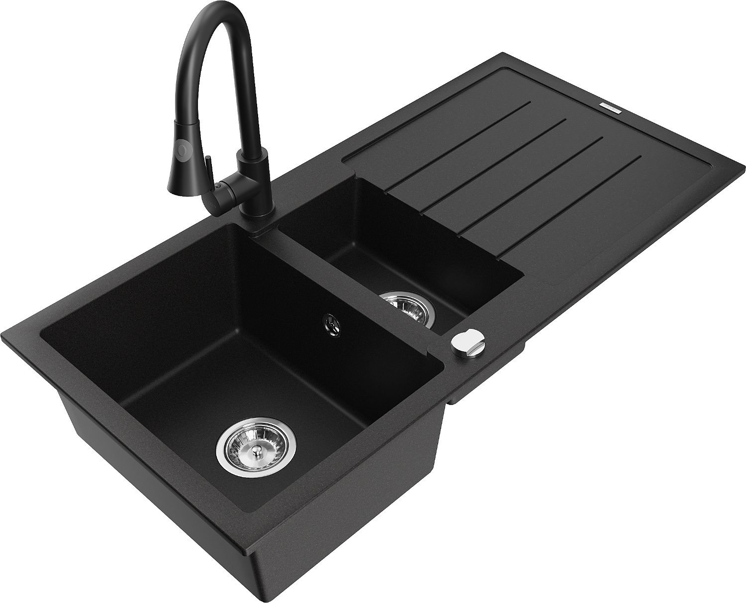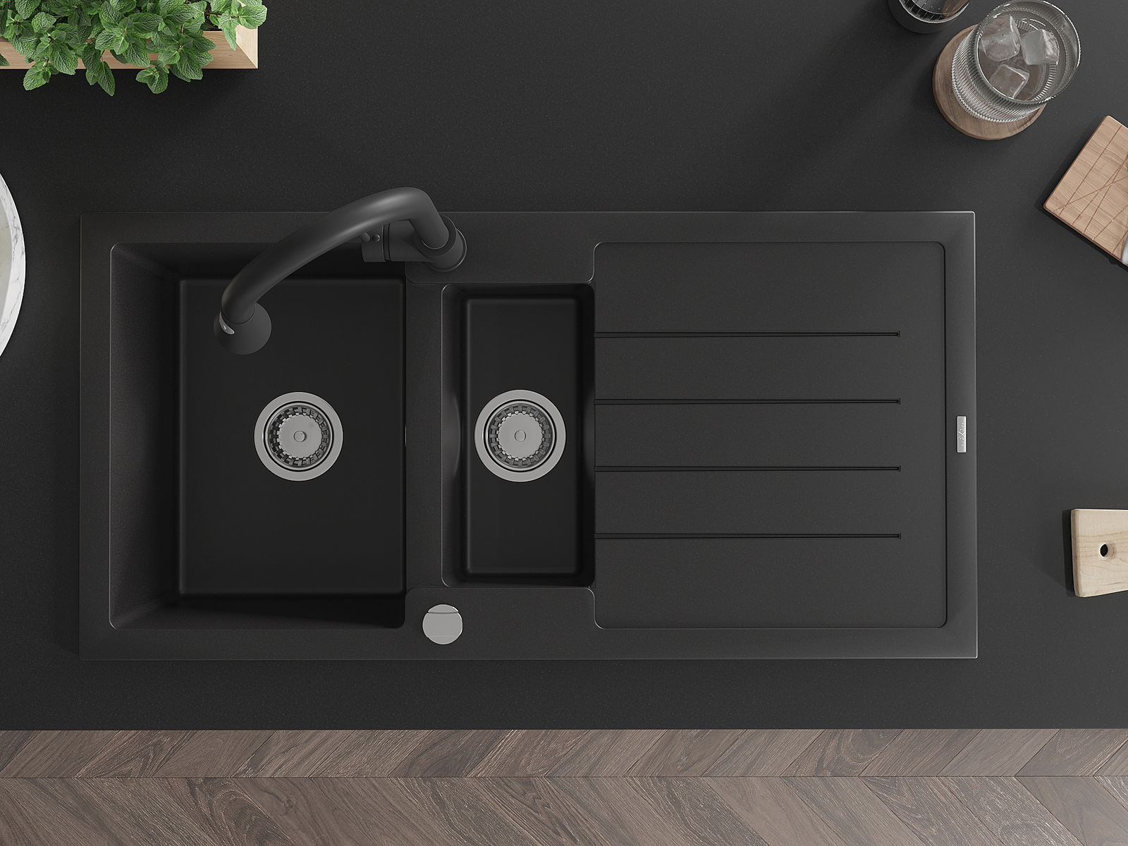 Mexen Andres granito kriauklė 1,5 kamerų su nutekėjimu ir virtuviniu maišytuvu Elia, juoda - 6515-77-670101-70