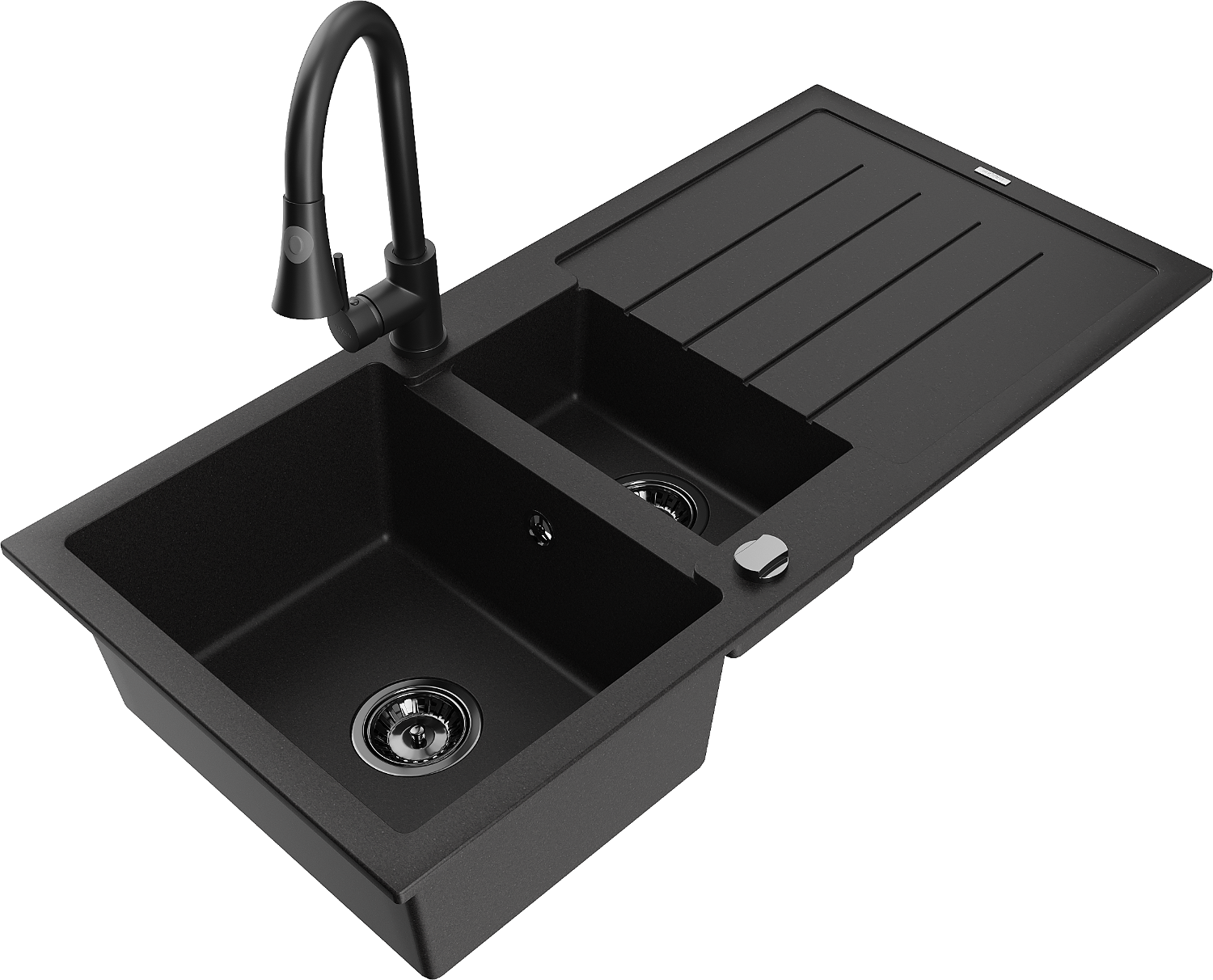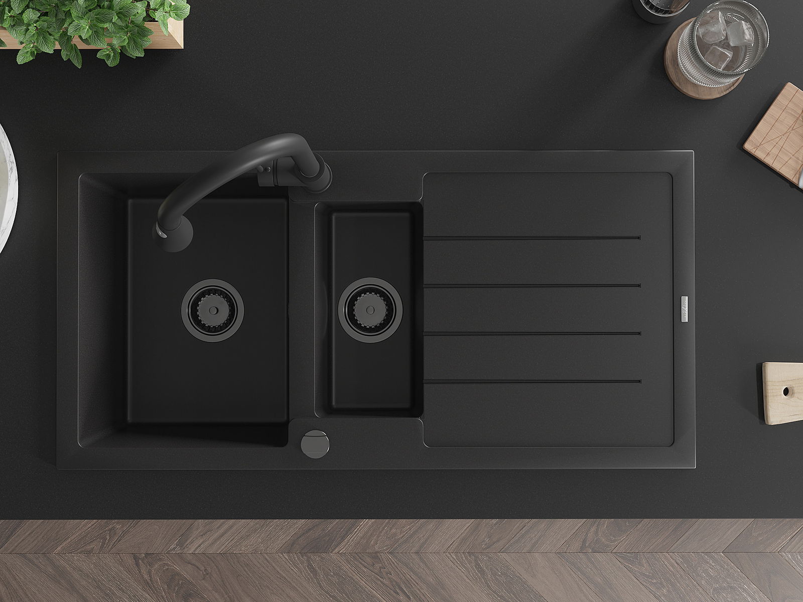 Mexen Andres granitinė 1,5 skylių plautuvė su nusausintuvu ir virtuviniu maišytuvu Elia, juoda - 6515-77-670101-70-B