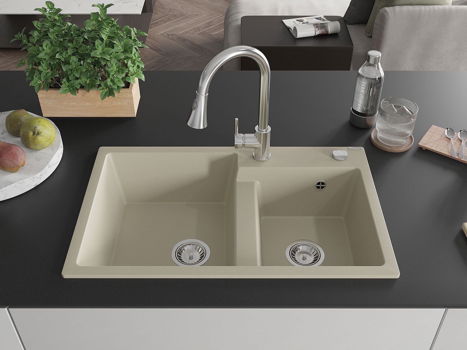 Mexen Tomas granito virtuvės dviejų skyrių plautuvė su Elia maišytuvu, smėlio spalvos - 6516-69-670101-00