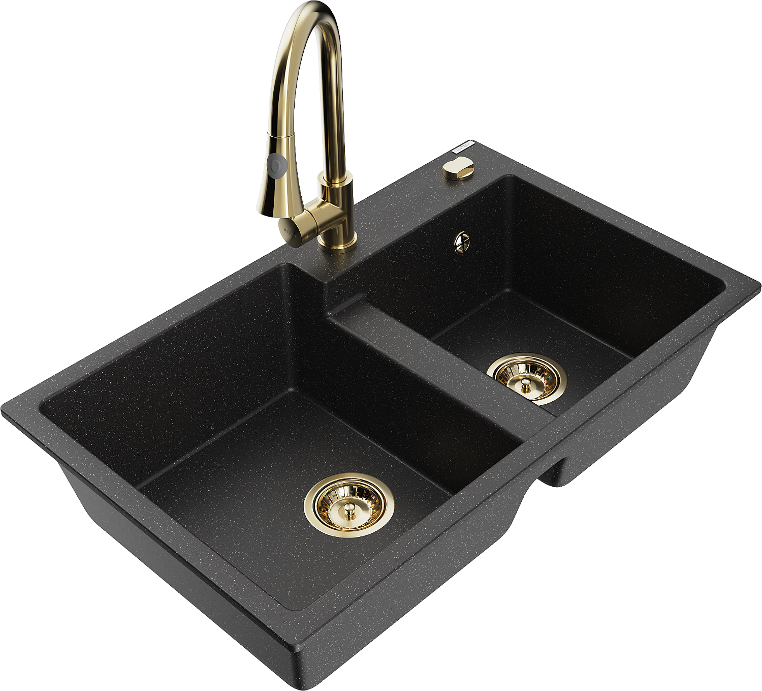 Mexen Tomas granito plautuvė 2 kamerų su virtuviniu maišytuvu Elia, juodas/sidabrinis metalikas - 6516-73-670101-50