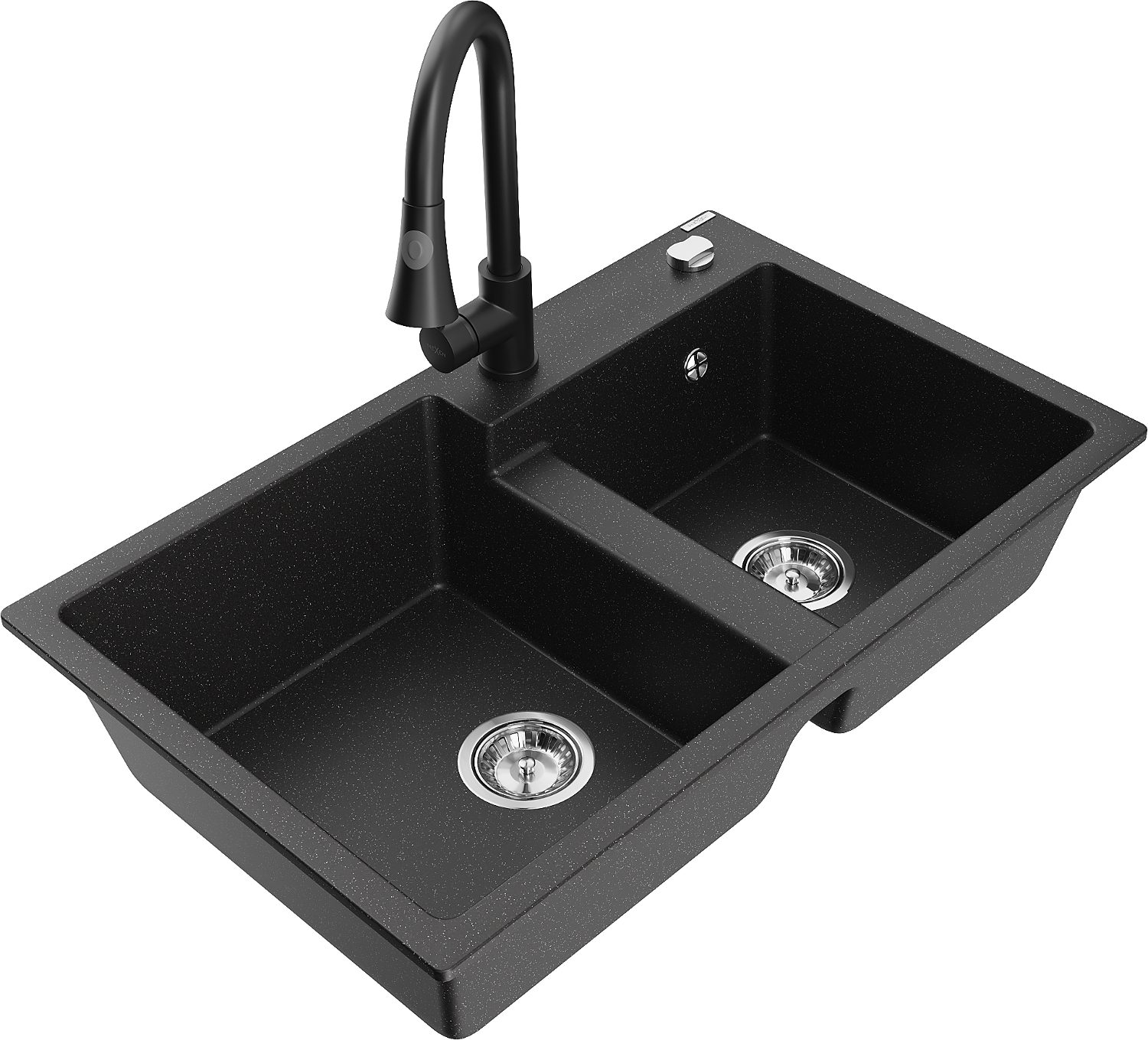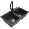 Mexen Tomas granitinis dviejų skylių plautuvas su virtuviniu maišytuvu Elia, juodas/sidabrinis metalikas - 6516-73-670101-70