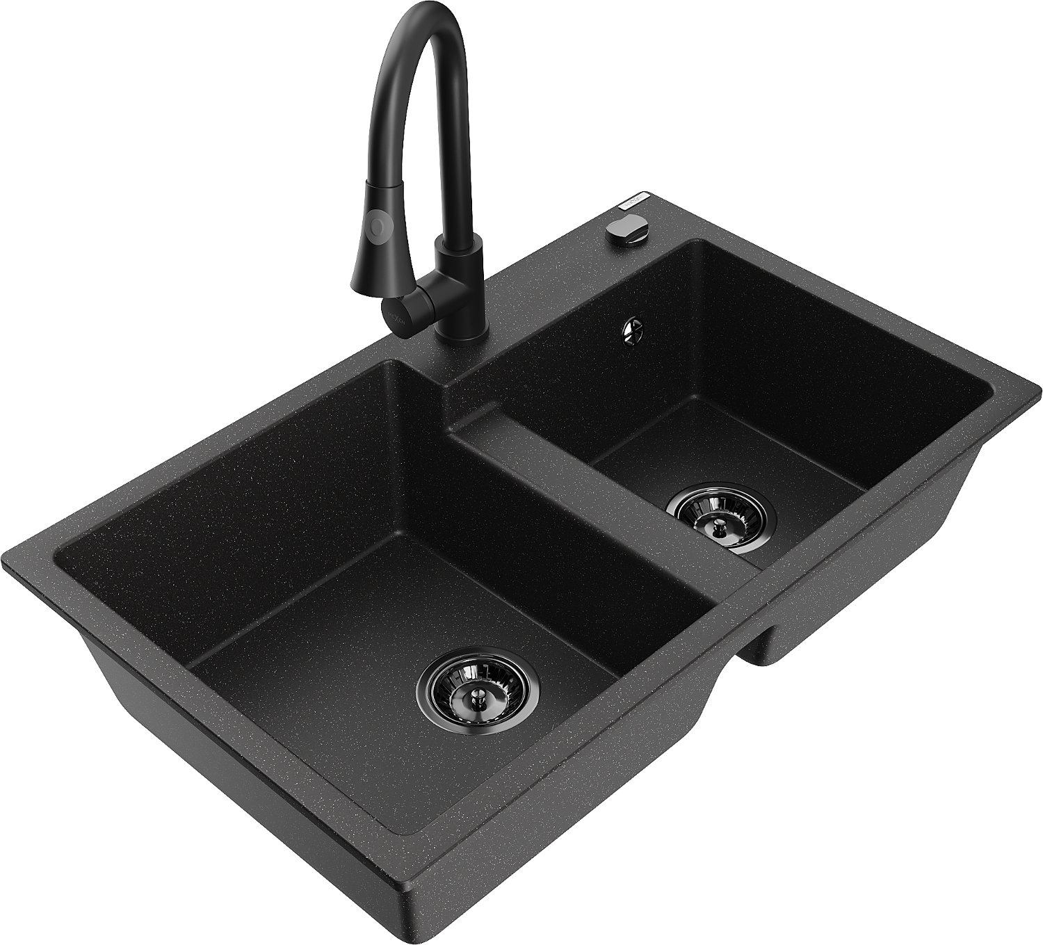Mexen Tomas granito plautuvė su 2 kameromis ir virtuvės maišytuvu Elia, juodas/sidabrinis metalikas - 6516-73-670101-70-B