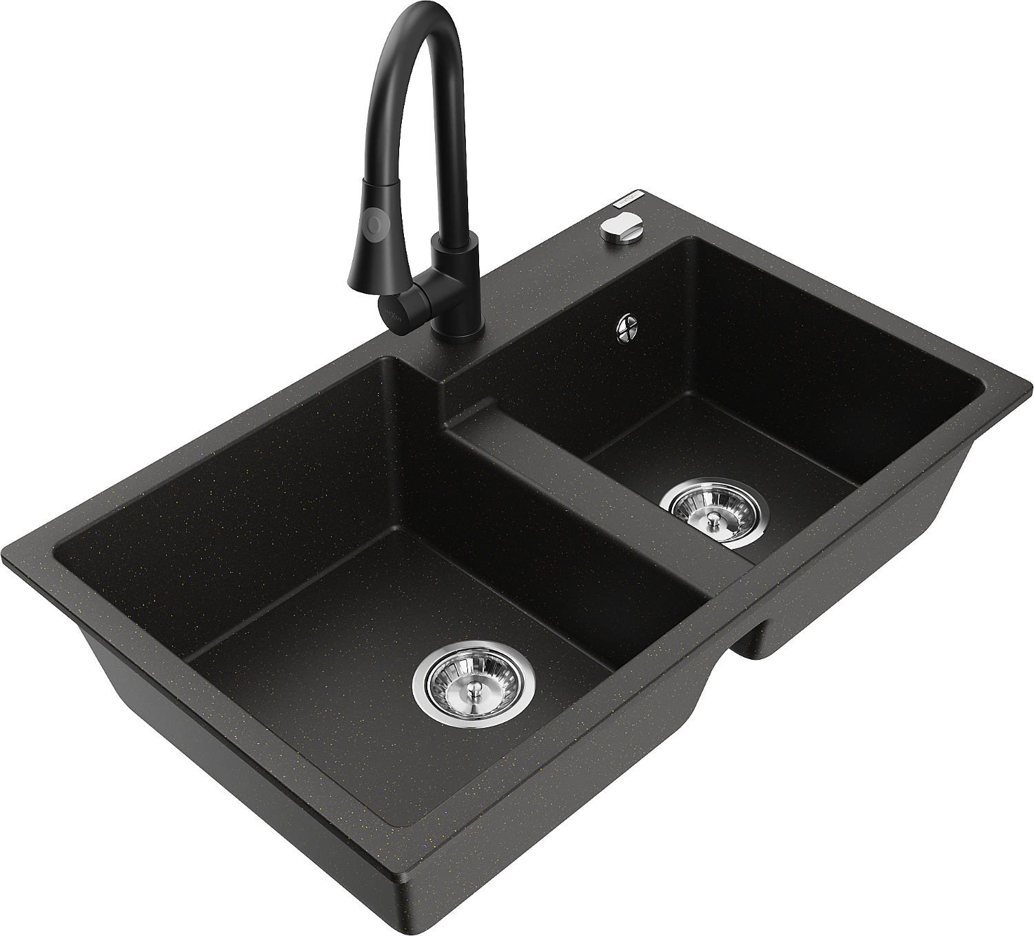 Mexen Tomas granito plautuvė 2 skyrių su virtuvės maišytuvu Elia, juodas/auksinis metalikas - 6516-75-670101-70