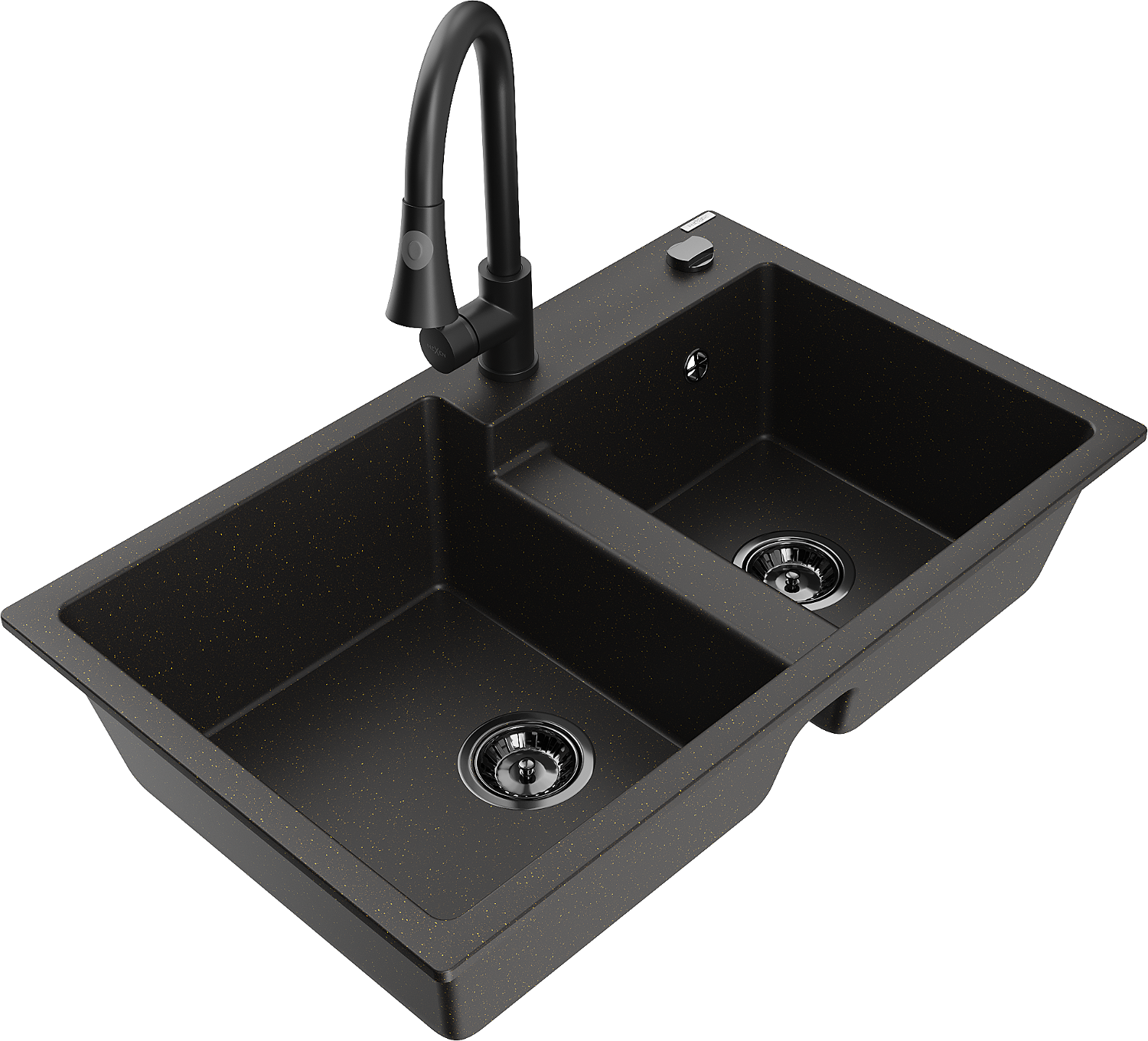 Mexen Tomas granitinė 2-jų skyrių plautuvė su virtuviniu maišytuvu Elia, juoda/auksinė metalikas - 6516-75-670101-70-B
