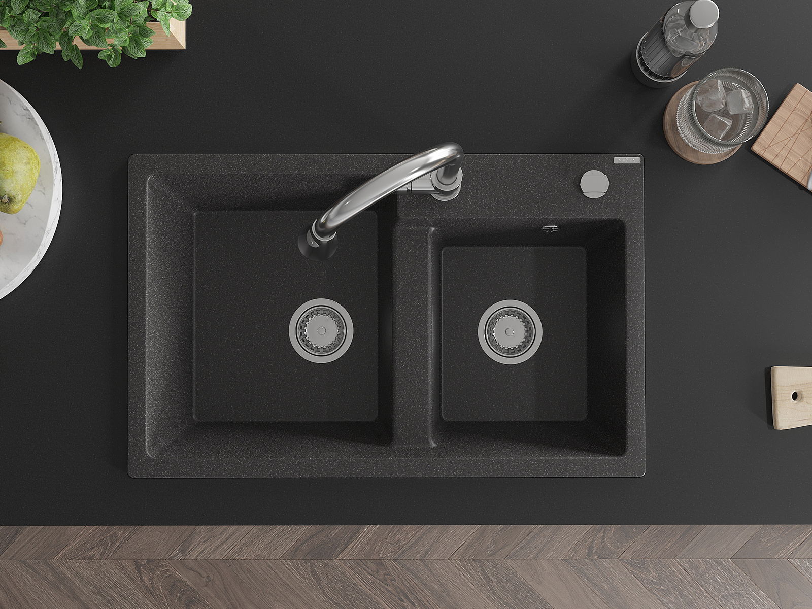 Mexen Tomas 2 kamerų granitinė virtuvės kriauklė su Elia virtuvės maišytuvu, juoda su taškeliais - 6516-76-670101-00