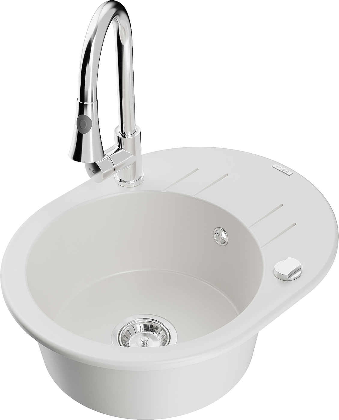Mexen Kevin vienos kameros granitinė plautuvė su nutekėjimu ir virtuviniu maišytuvu Elia, balta - 6517-20-670101-00