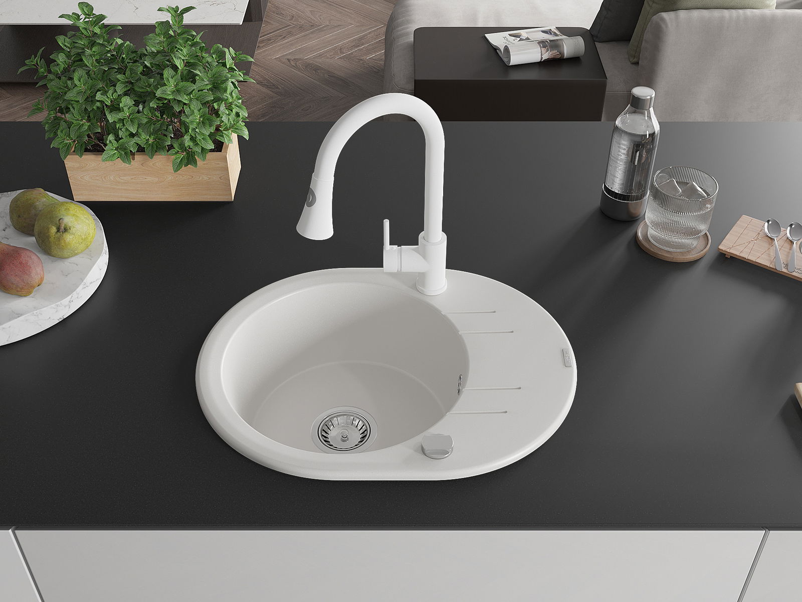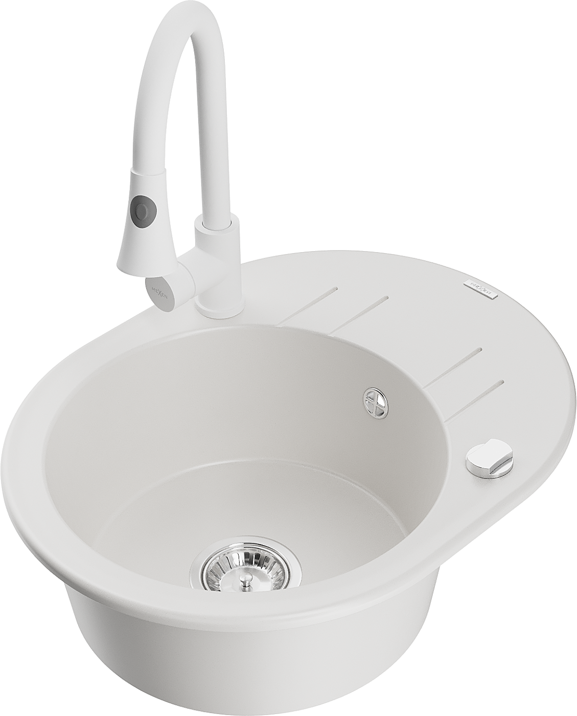 Mexen Kevin granitinė vienos kameros plautuvė su indaplove ir virtuviniu maišytuvu Elia, balta - 6517-20-670101-20