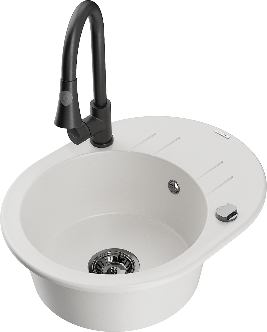 Mexen Kevin vienos kameros granitinis plautuvas su nusausintoju ir virtuvės maišytuvu Elia, baltas - 6517-20-670101-70
