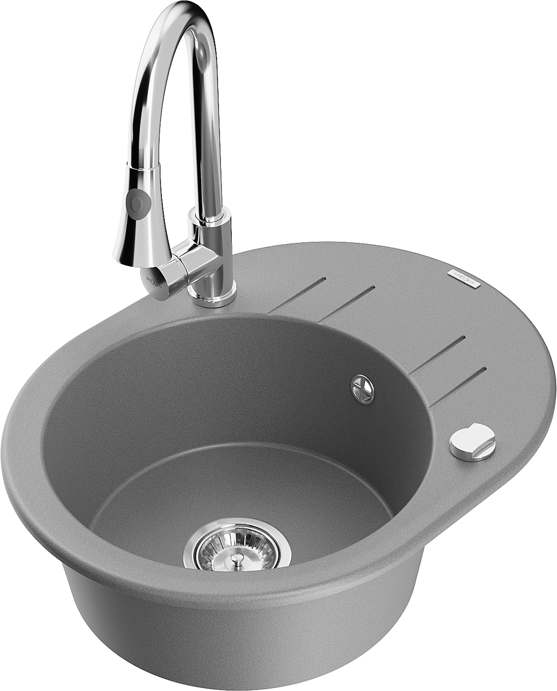 Mexen Kevin vienos komoros granitinė kriauklė su nuvarvėjimo zona ir virtuvės maišytuvu Elia, pilka - 6517-71-670101-00