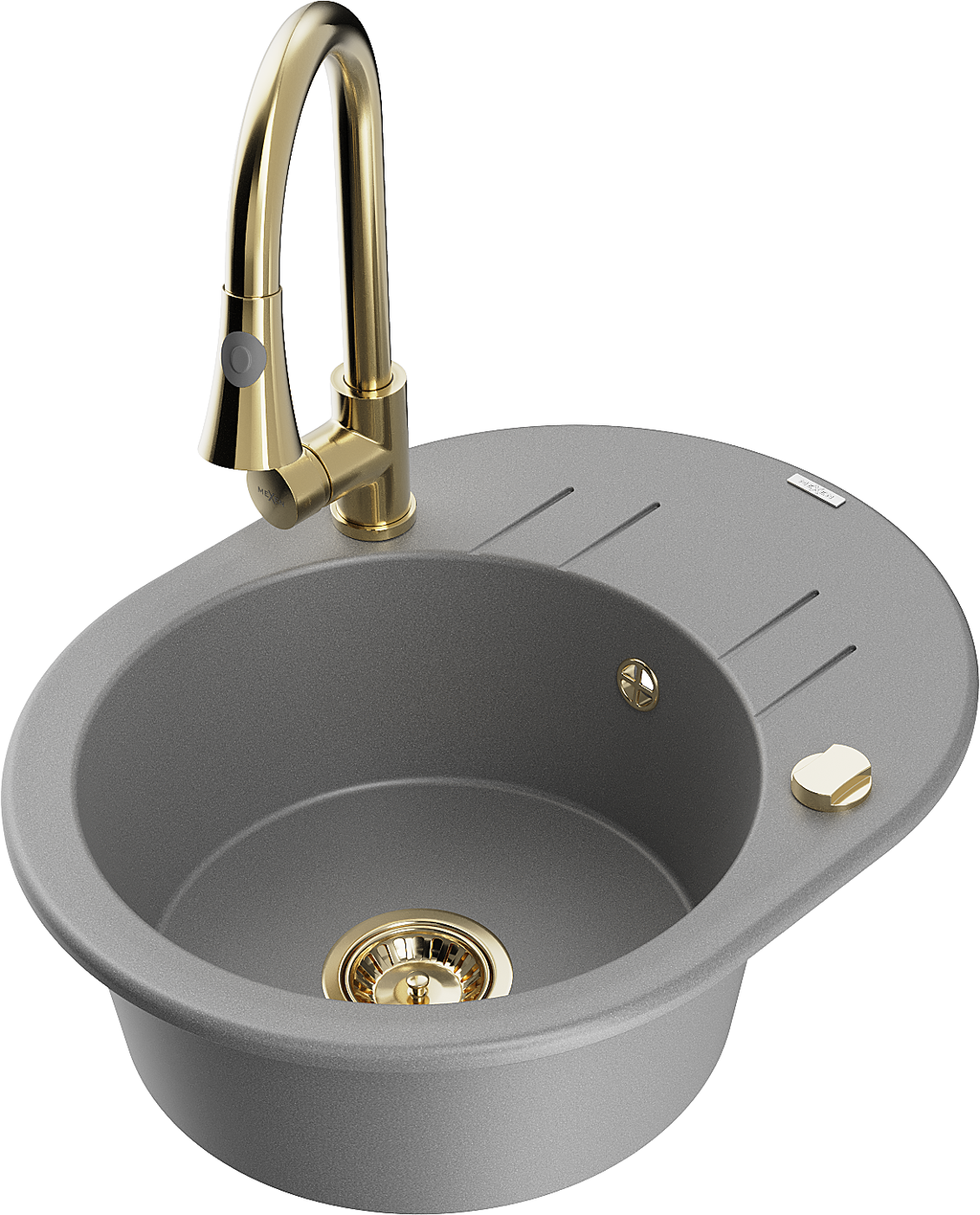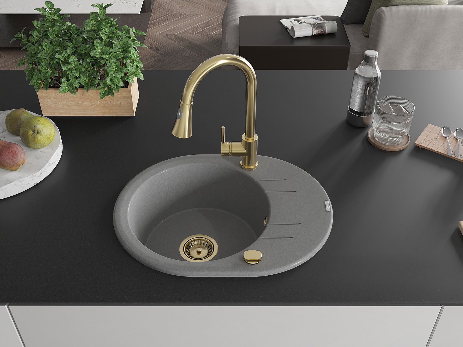 Mexen Kevin vienos kameros granitinis plautuvas su nusausintuvu ir virtuviniu maišytuvu Elia, pilkas - 6517-71-670101-50