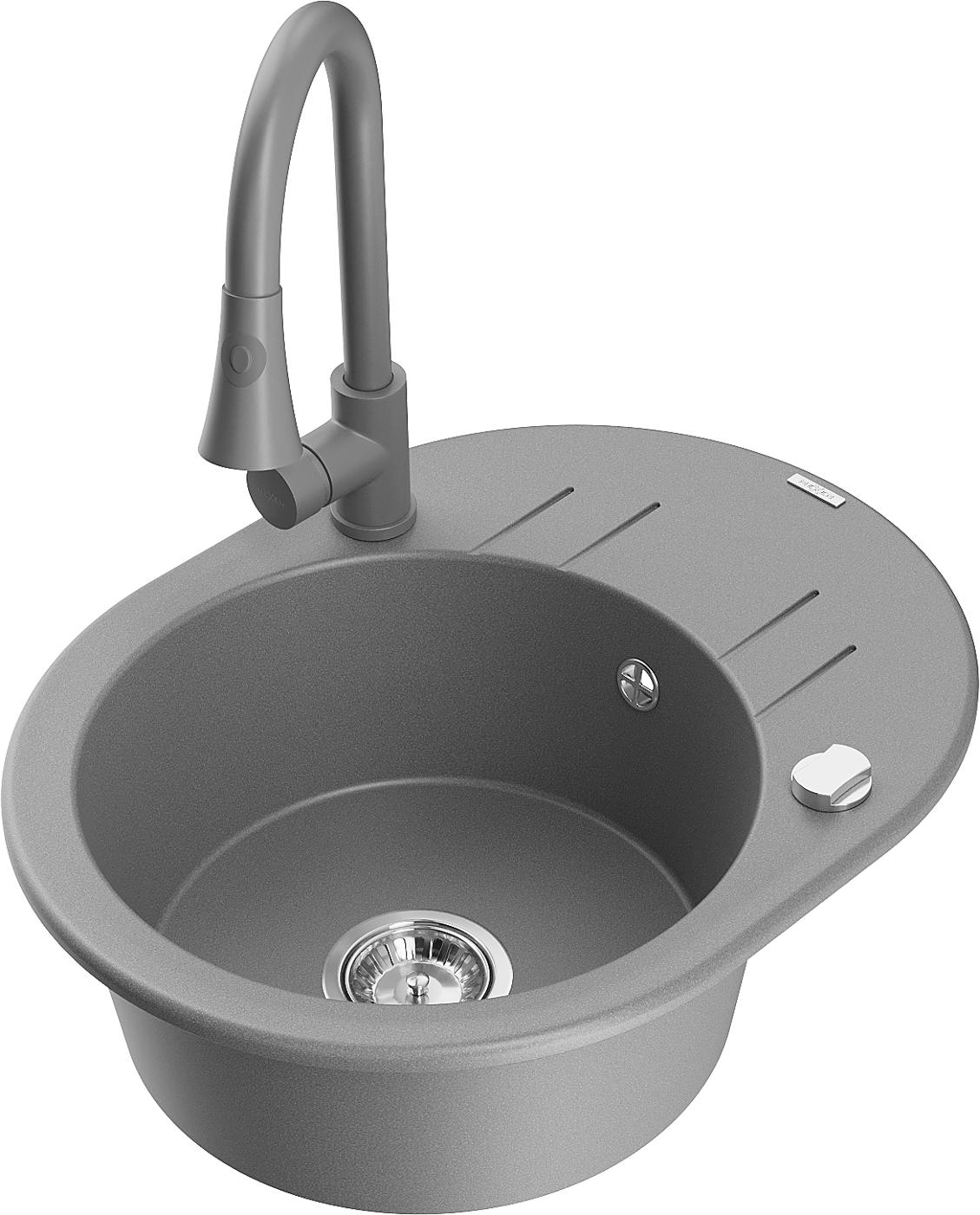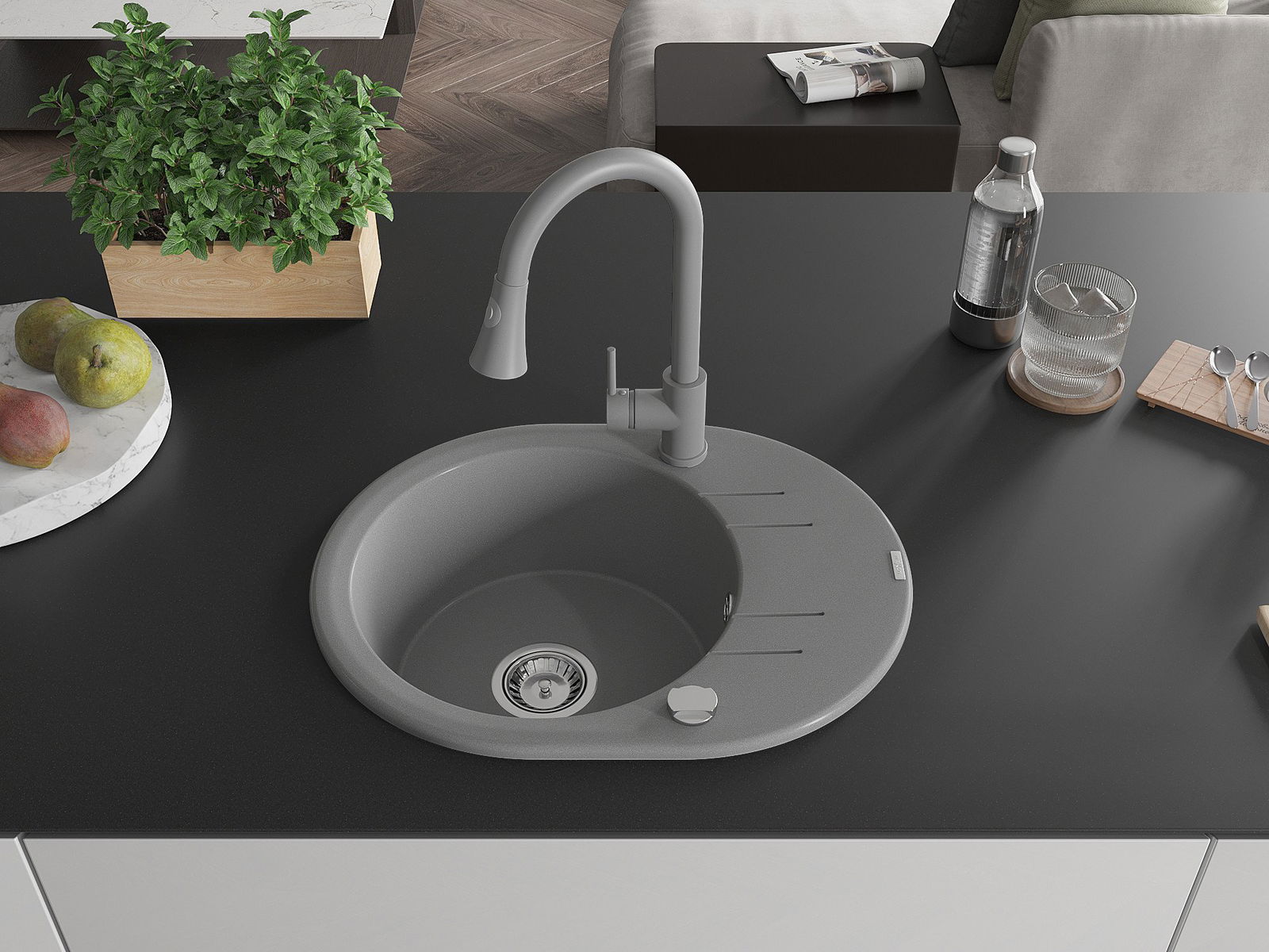Mexen Kevin vienos plautuvės granitinis kriauklė su įlankiu ir virtuvės maišytuvu Elia, pilka - 6517-71-670101-71