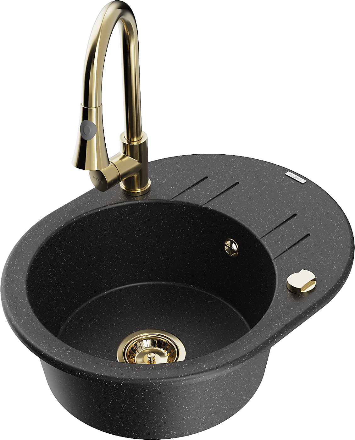 Mexen Kevin granitinė vienos kameros virtuvės kriauklė su nutekėjimu ir virtuvės maišytuvu Elia, juodos/sidabrinės