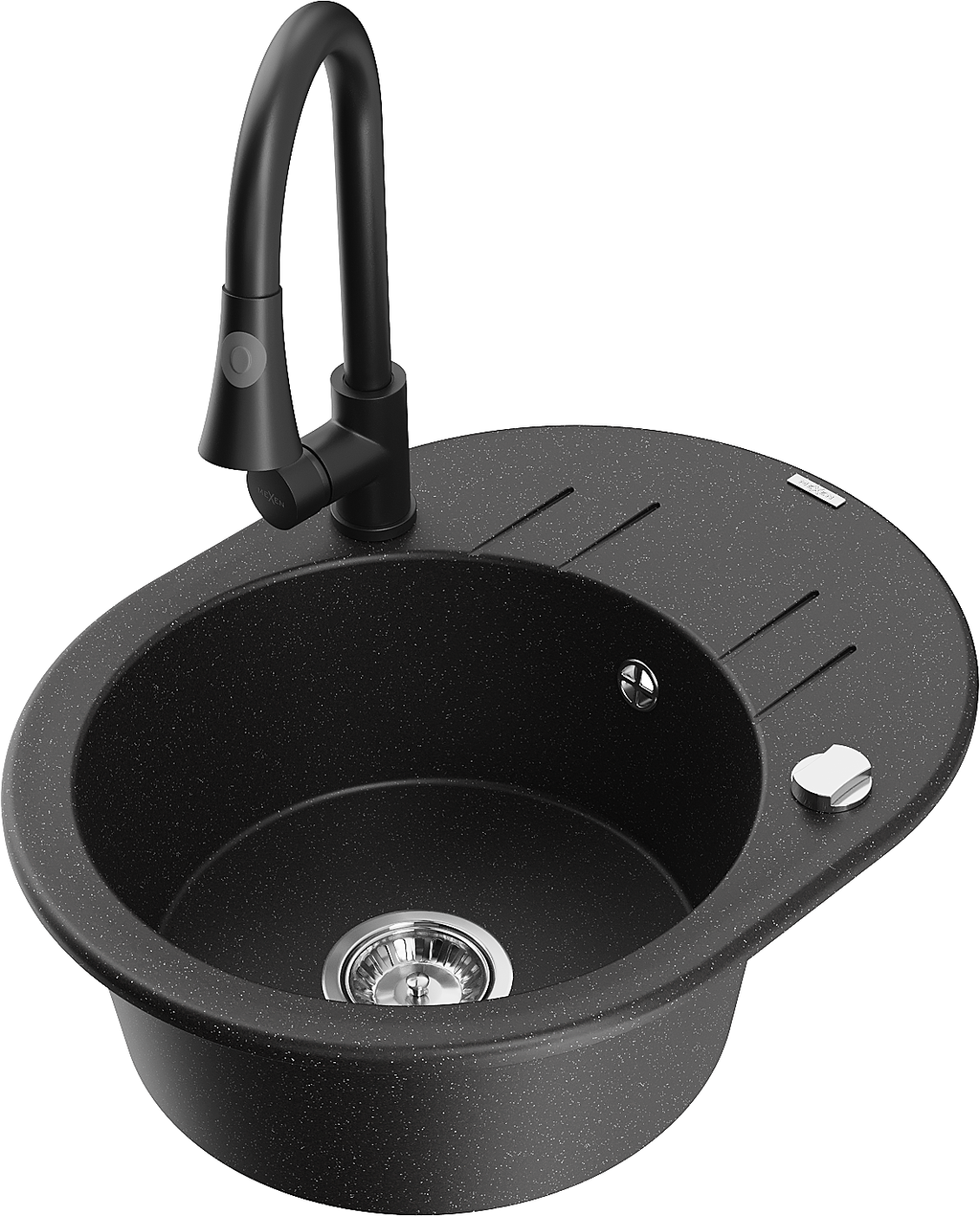 Mexen Kevin vienos kameros granitinė kriauklė su drenažu ir virtuviniu maišytuvu Elia, juoda/sidabrinė metaliko