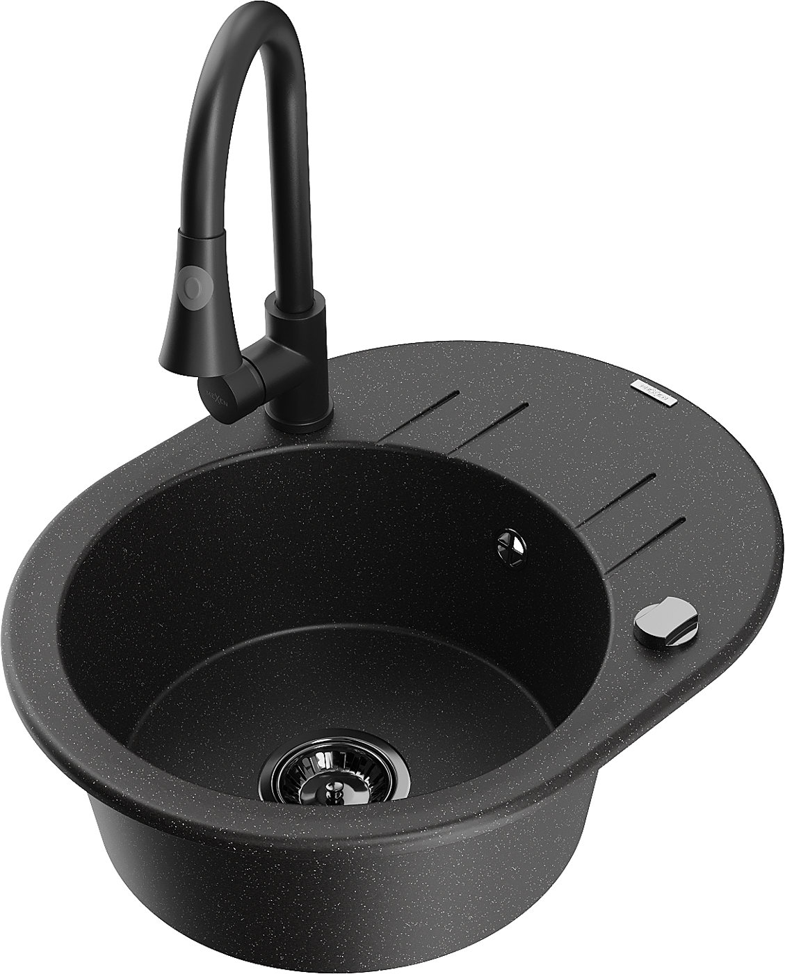 Mexen Kevin granitinė virtuvės plautuvė su viena kamera, nusausintuvu ir Elia virtuviniu maišytuvu, juoda/sidabrinė