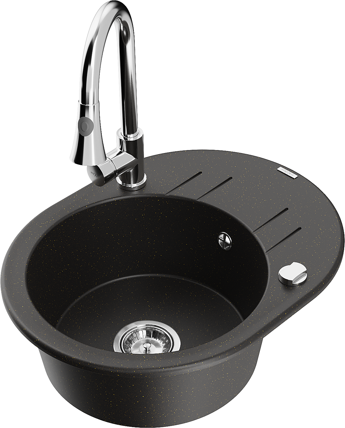 Mexen Kevin granitinė plautuvė su viena kamera, nutekėjimo lentynėle ir Elia virtuvinis maišytuvas, juoda/auksinė metalika