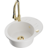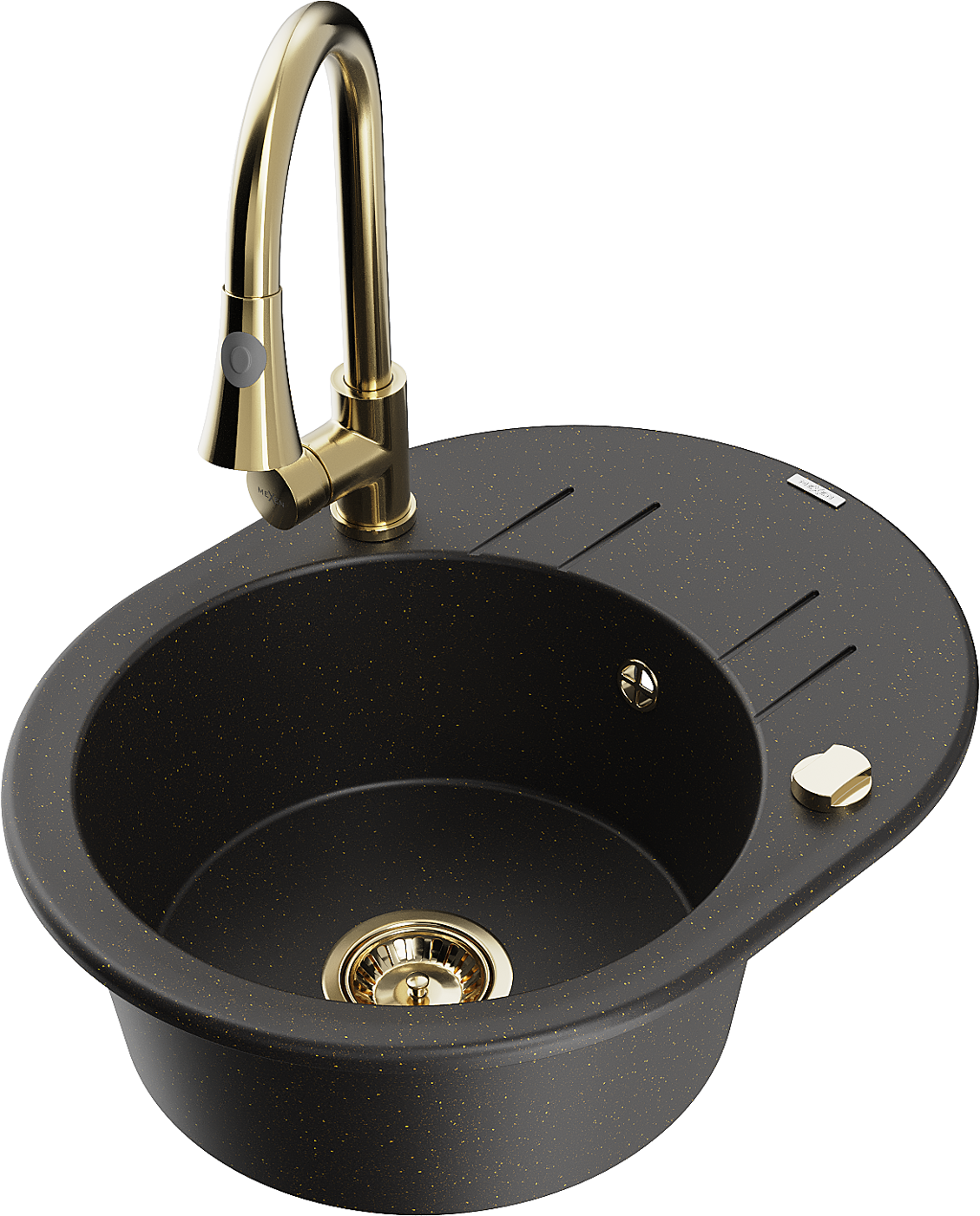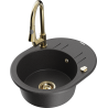 Mexen Kevin granitinė vienos kameros kriauklė su nusausintuvu ir virtuviniu maišytuvu Elia, juoda/auksinė metalo spalva