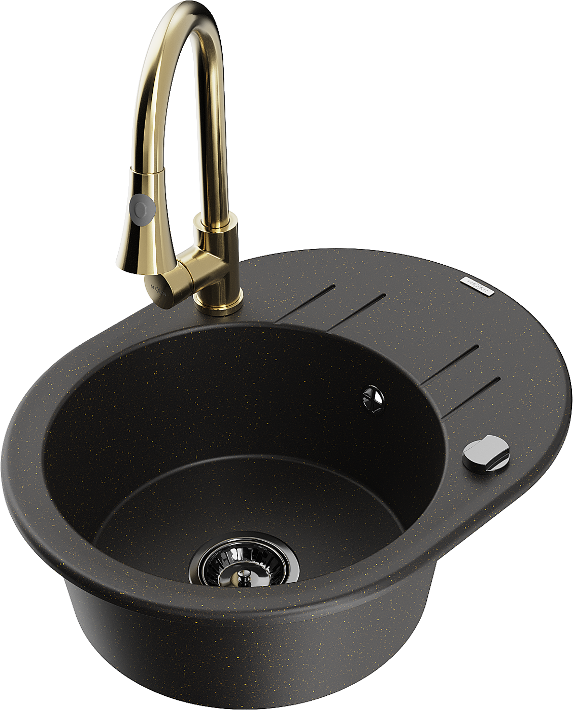 Mexen Kevin granitinė plautuvė su 1 skyriumi su nutekėjimu ir virtuviniu maišytuvu Elia, juodas/auksinis metalikas - 6517-75-67?