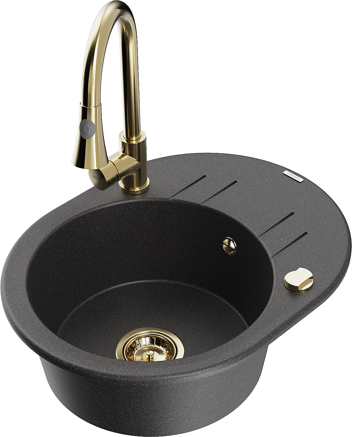 Mexen Kevin granitinė vienos sekcijos plautuvė su indų džiovyklė ir Elia virtuvės maišytuvu, juoda su taškeliais