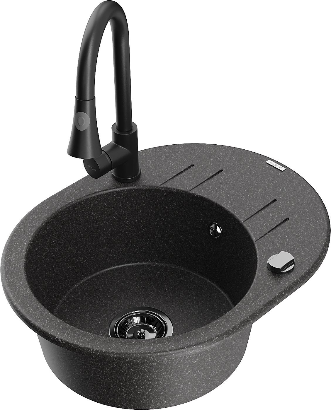 Mexen Kevin granitinė plautuvė su nuvarvėjimo lenta ir virtuviniu maišytuvu Elia, juodas taškuotas - 6517-76-670101-70-B