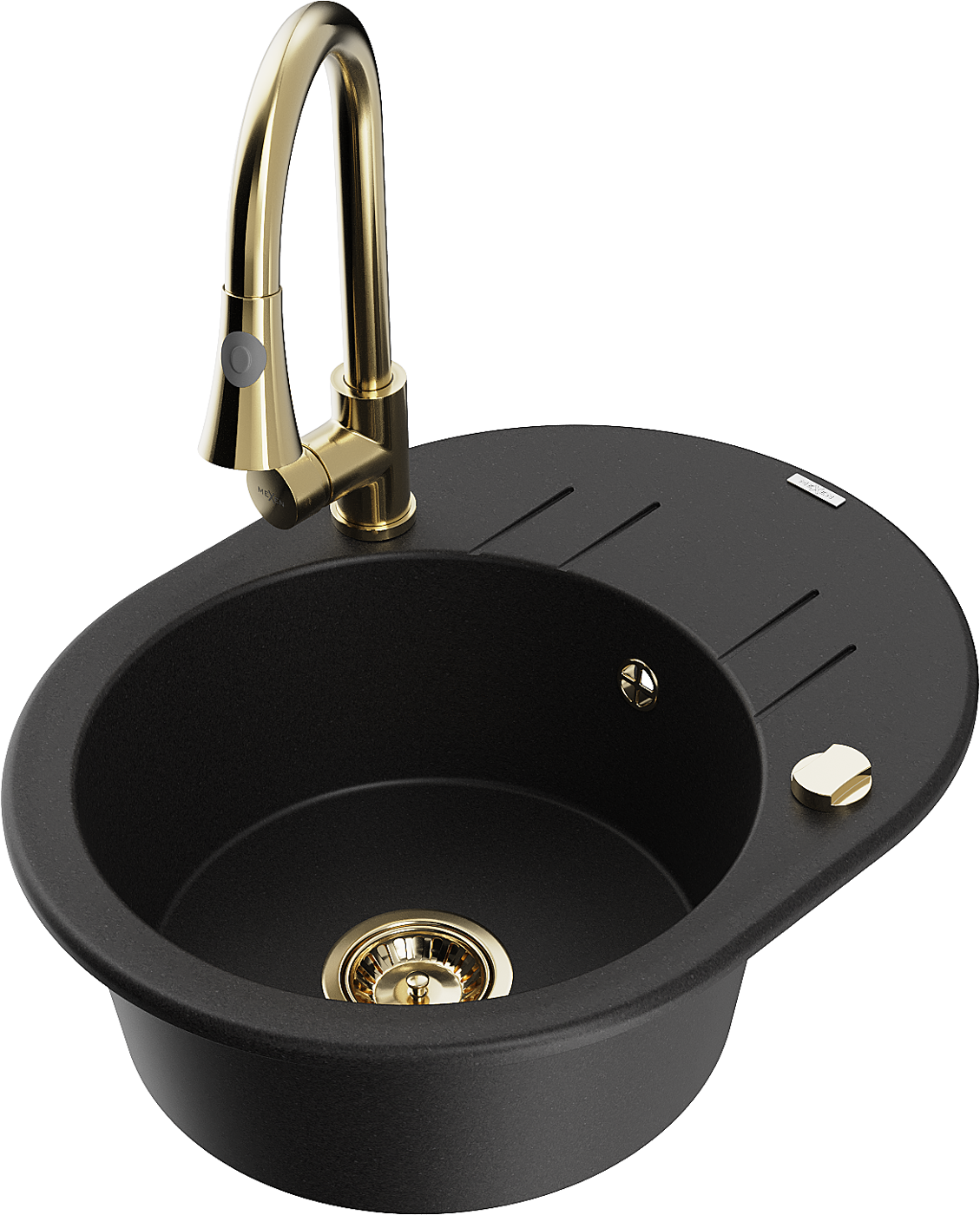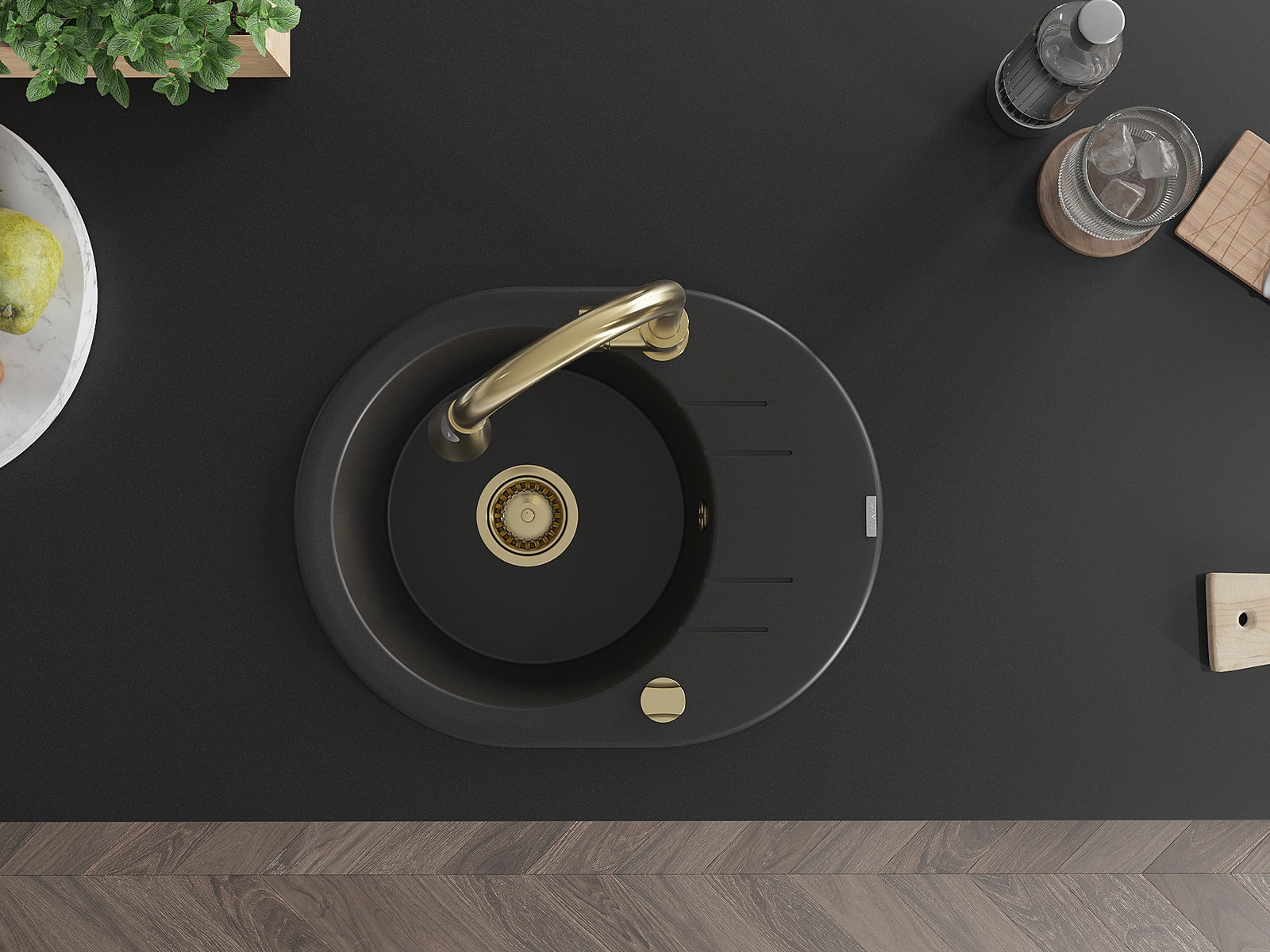 Mexen Kevin granitinis virtuvės kriauklė 1-dubeninis su lašintuvu ir Elia virtuvės maišytuvu, juodas - 6517-77-670101-50