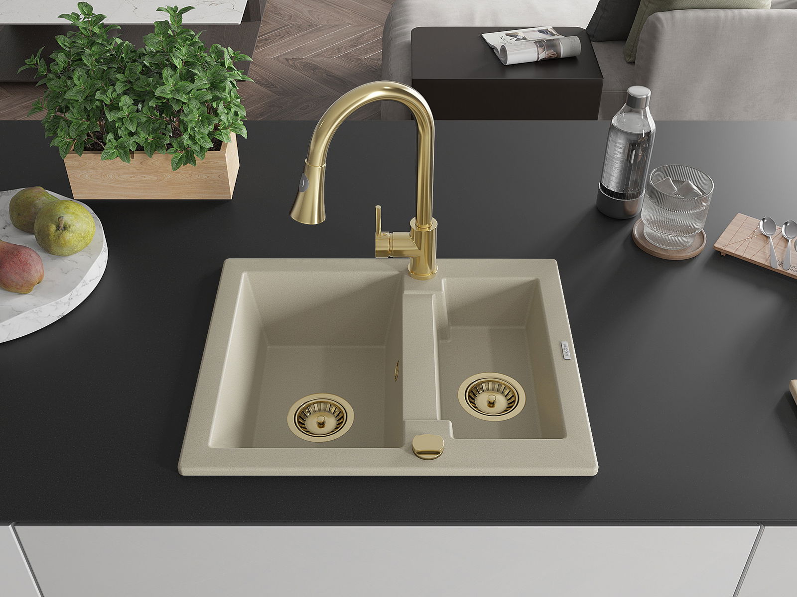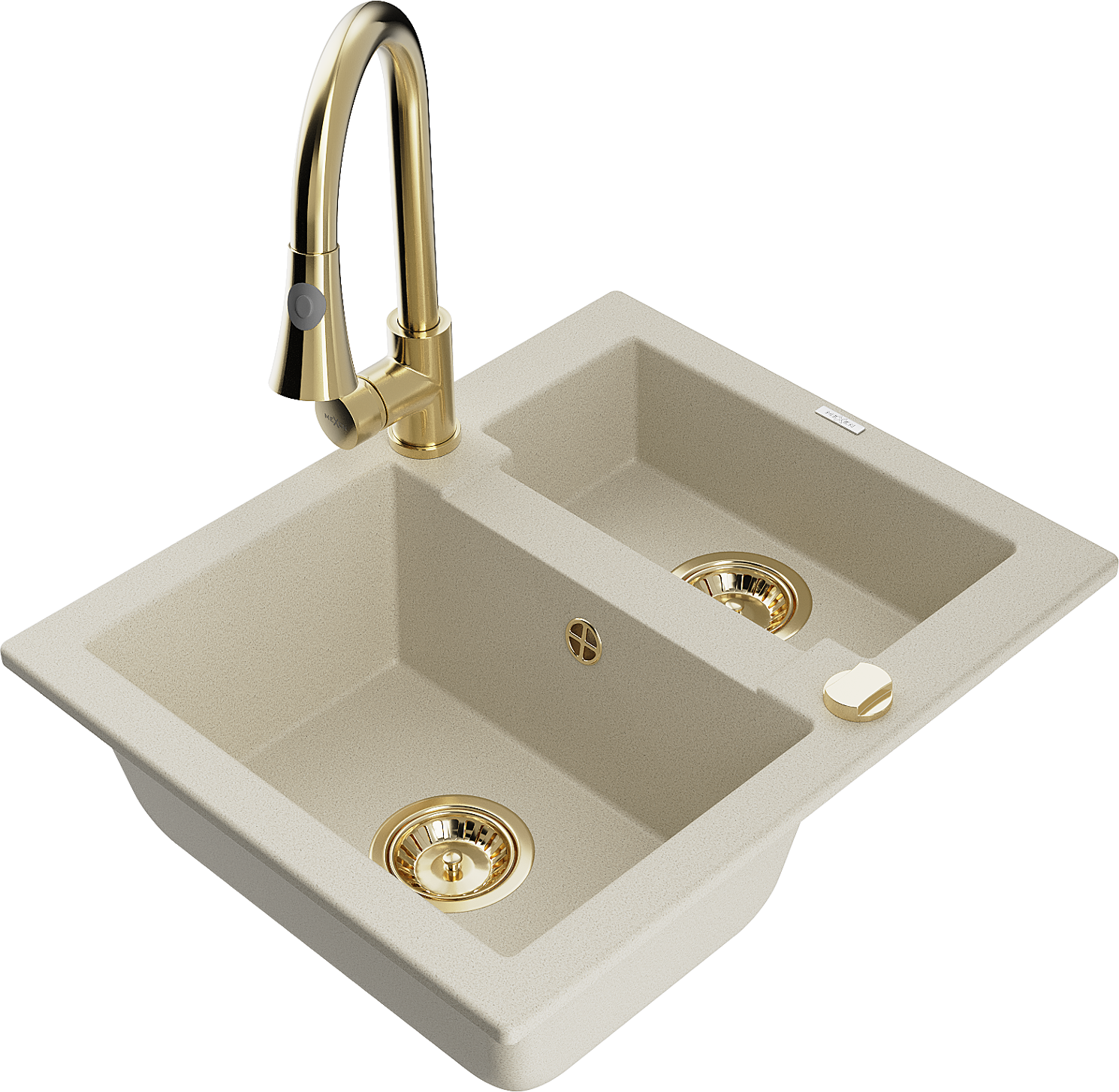 Mexen Carlos granitinė kriauklė 1,5 skyrių su virtuviniu maišytuvu Elia, smėlio - 6518-69-670101-50