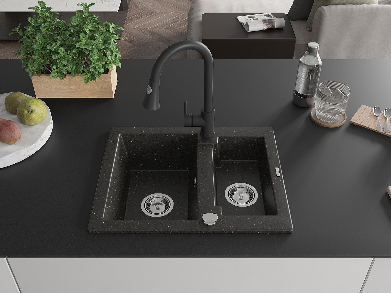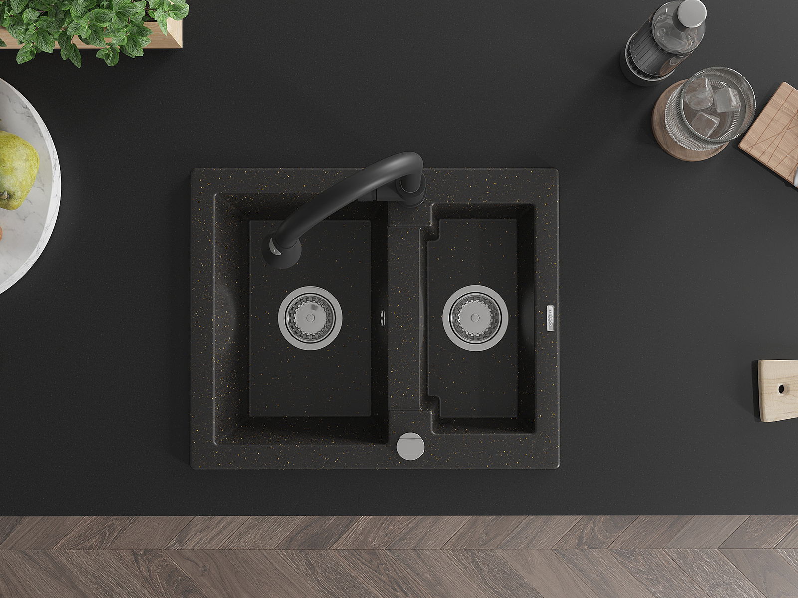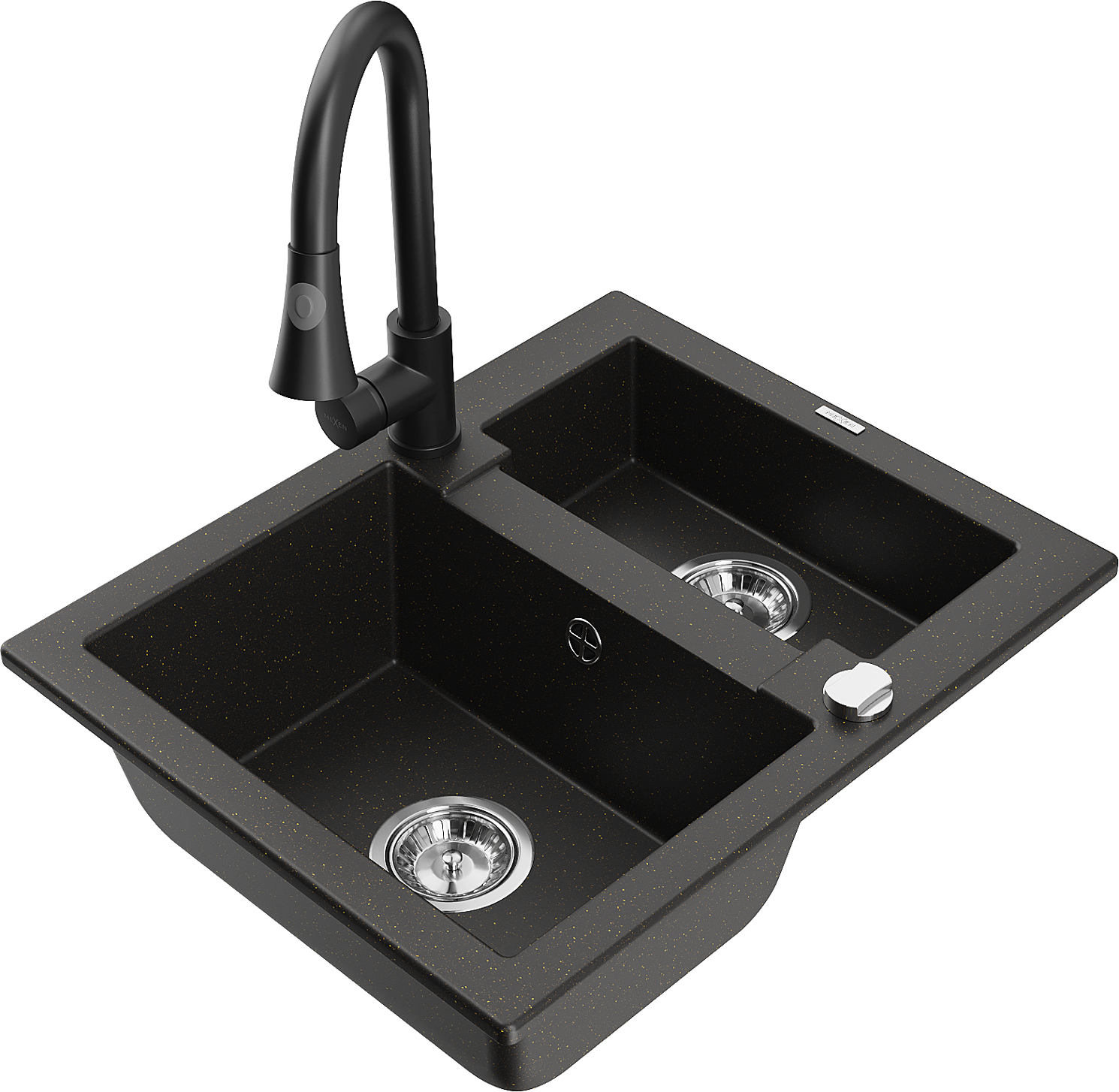Mexen Carlos granitinis plautuvė 1,5 skylių su virtuviniu maišytuvu Elia, juodas/auksinis metalinis - 6518-75-670101-70