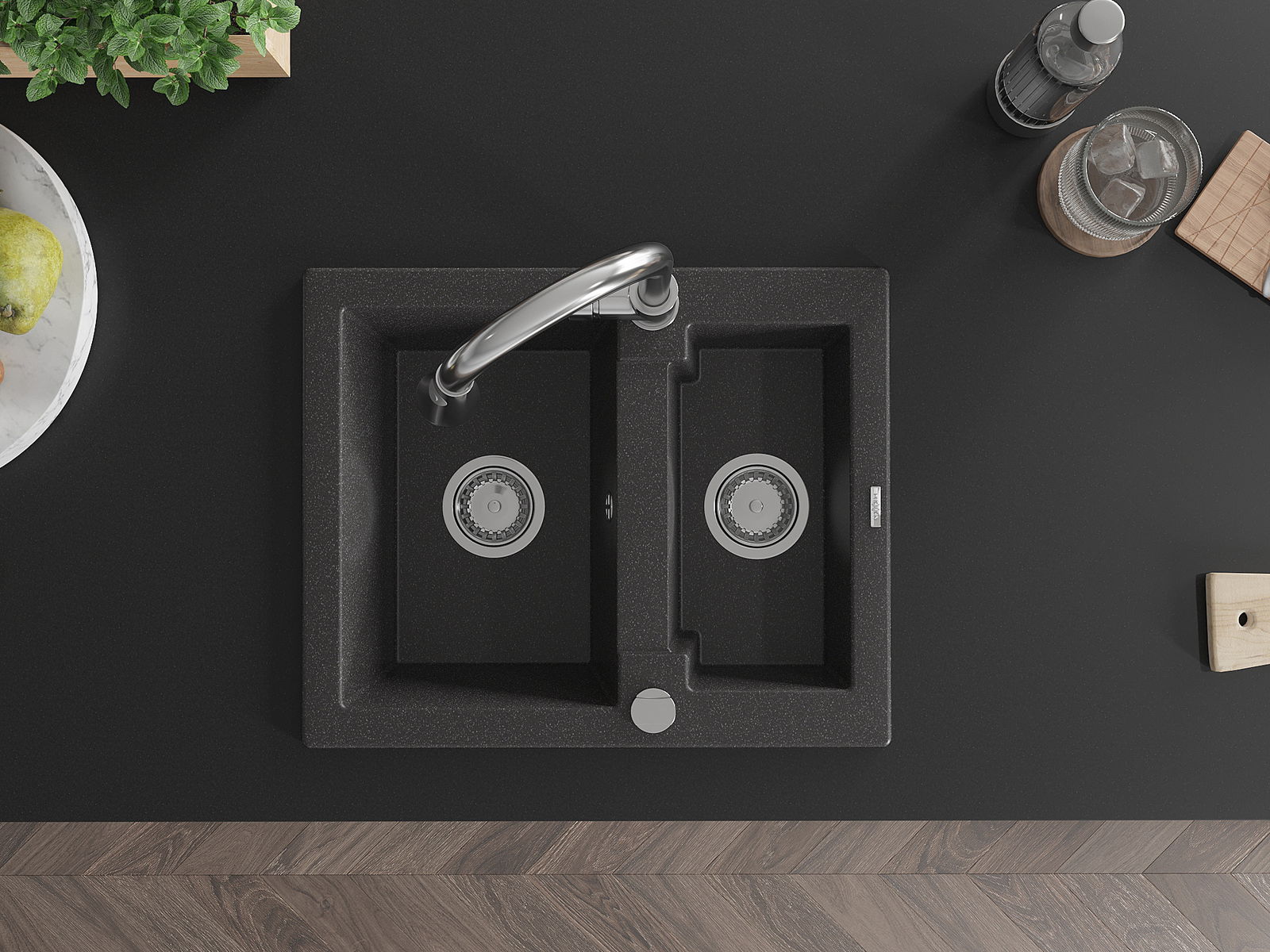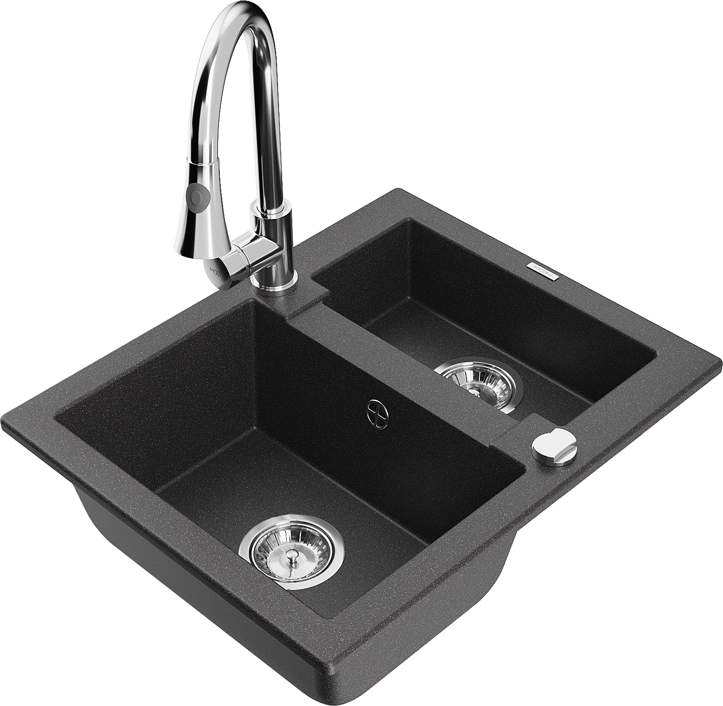 Mexen Carlos granitinis kriauklė 1,5 plautuvės su virtuviniu maišytuvu Elia, juodas taškuotas - 6518-76-670101-00